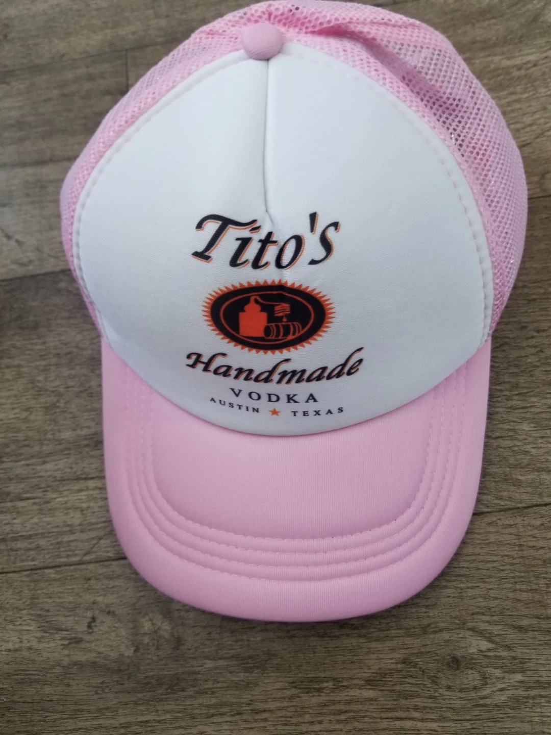 Selling a cute Tito's Handmade Vodka trucker hat! It's a light pink colour with a white front panel. Perfect for sunny days or adding a bit of fun to your outfit. Brand new