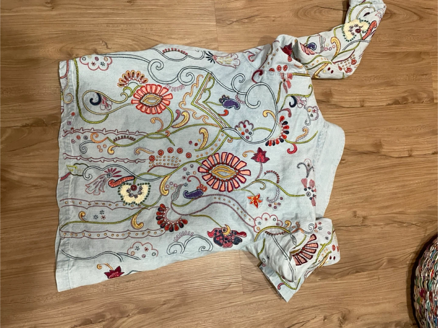 Selling a Chico's Design jacket with beautiful embroidery! The shell is made of 100% cotton, and the lining is also 100% cotton. The embroidery is 100% polyester, exclusive of decoration. It's a size S, unique embroidered jeans jacket