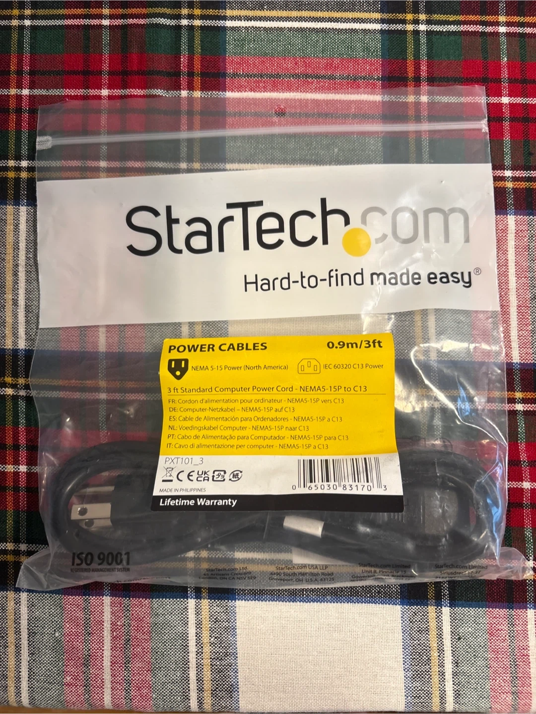 Giving away a StarTech.com 3 ft standard computer power cord. It's a NEMA5-15P to C13 type cable. The cable is 0.9m/3ft long and has a lifetime warranty.