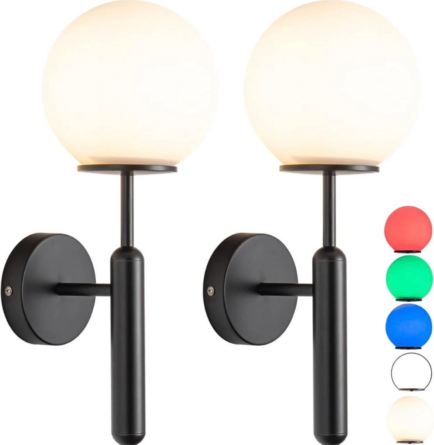 Selling a set of wall sconce lighting fixtures. These lights feature a modern design with a black finish and a round globe. They can also change colors!