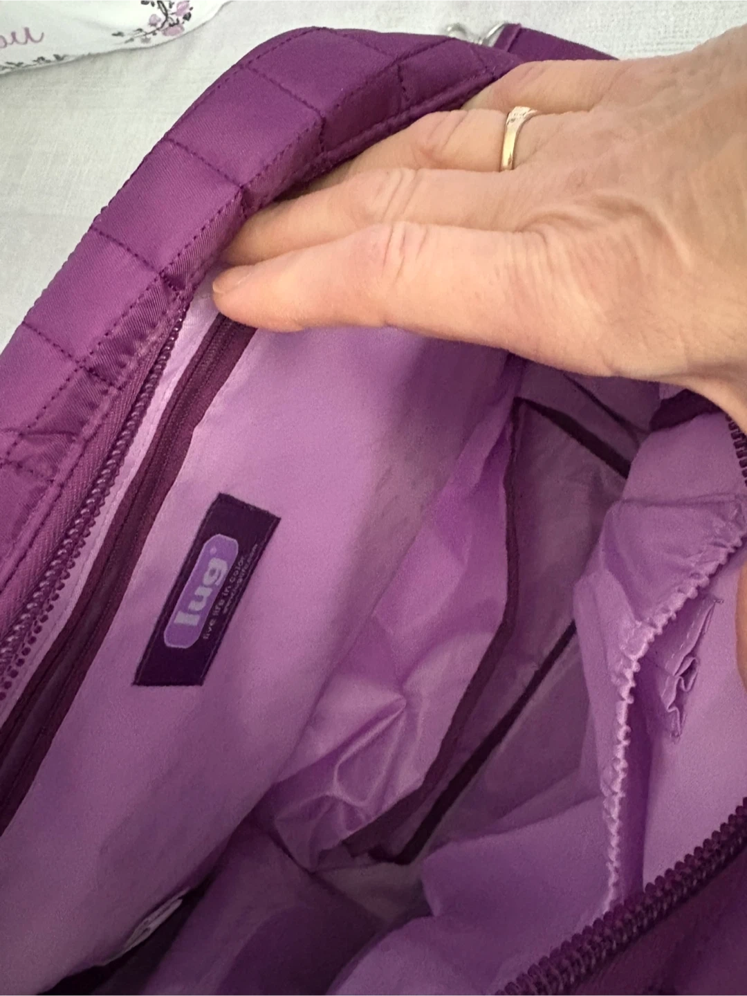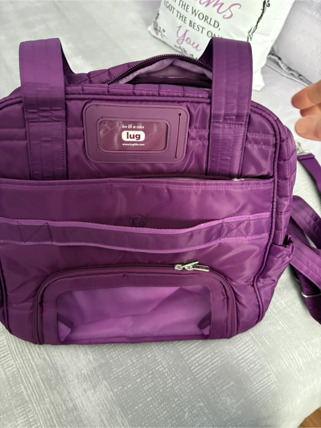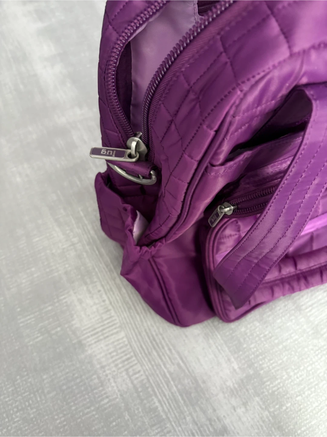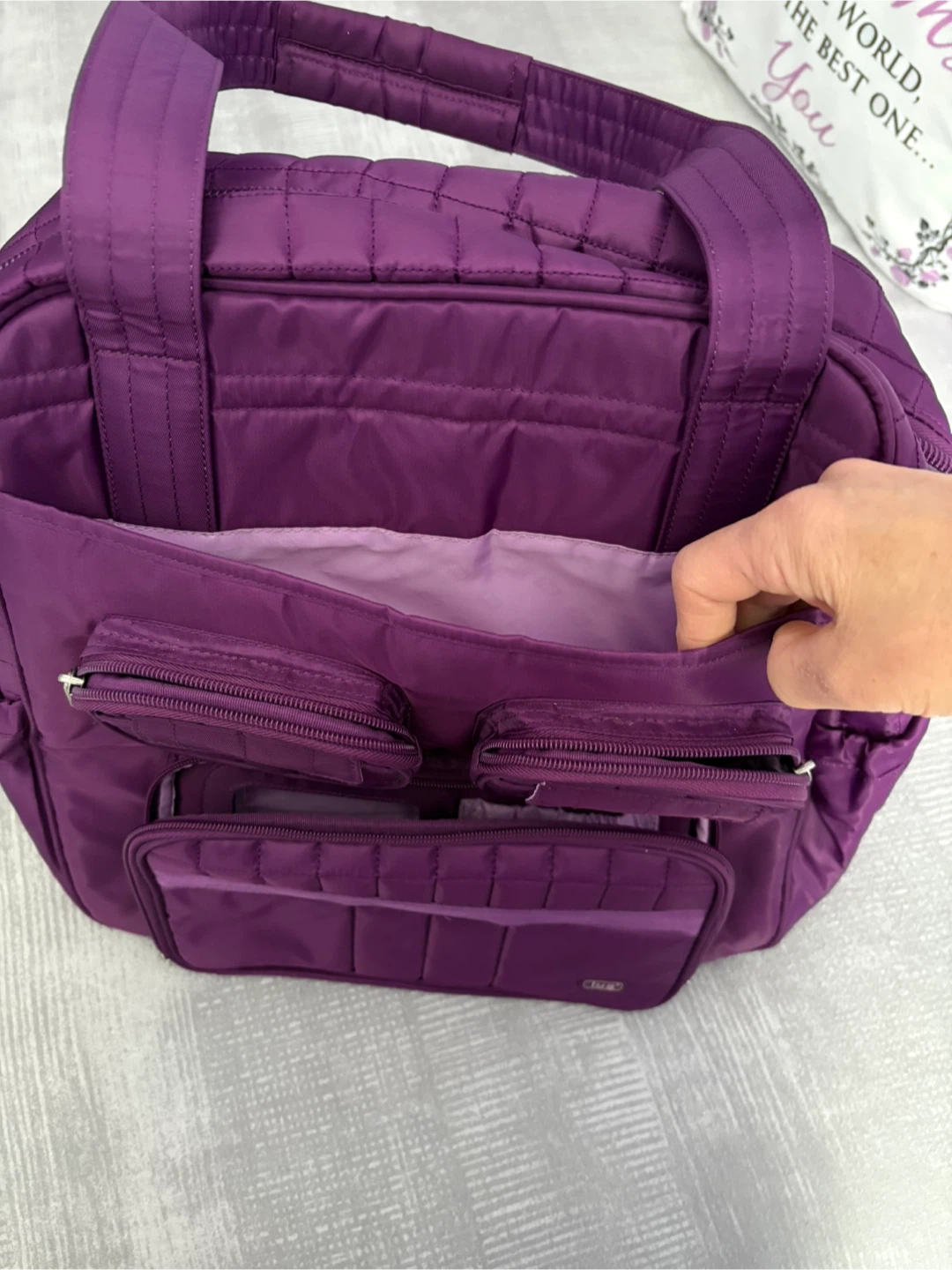 Selling a lovely purple quilted tote bag from Lug! It's in New condition and has lots of pockets for organizing all your essentials. Perfect for everyday use or travel. Has a strap on the back side to put over a suitcase handle.