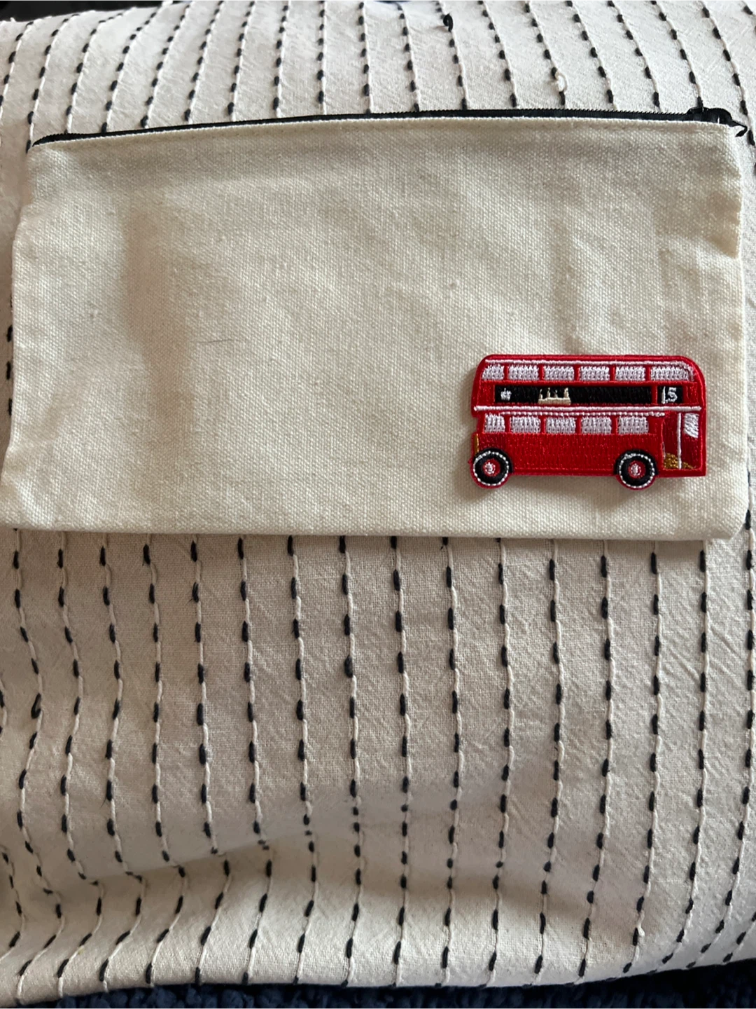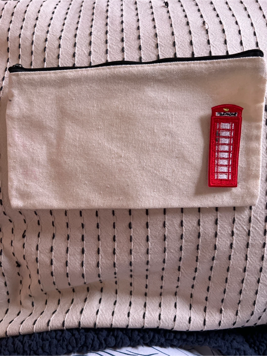 I'm selling a handmade canvas zipper pouch! It features cute London-themed patches, including a red telephone booth and a double-decker bus. Perfect for holding small items, cosmetics or pens/pencils.