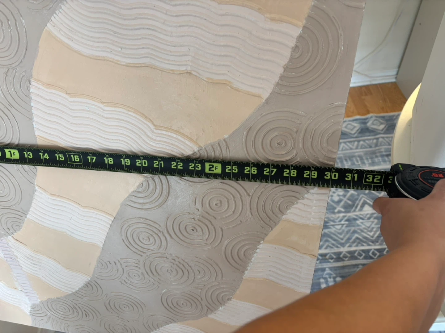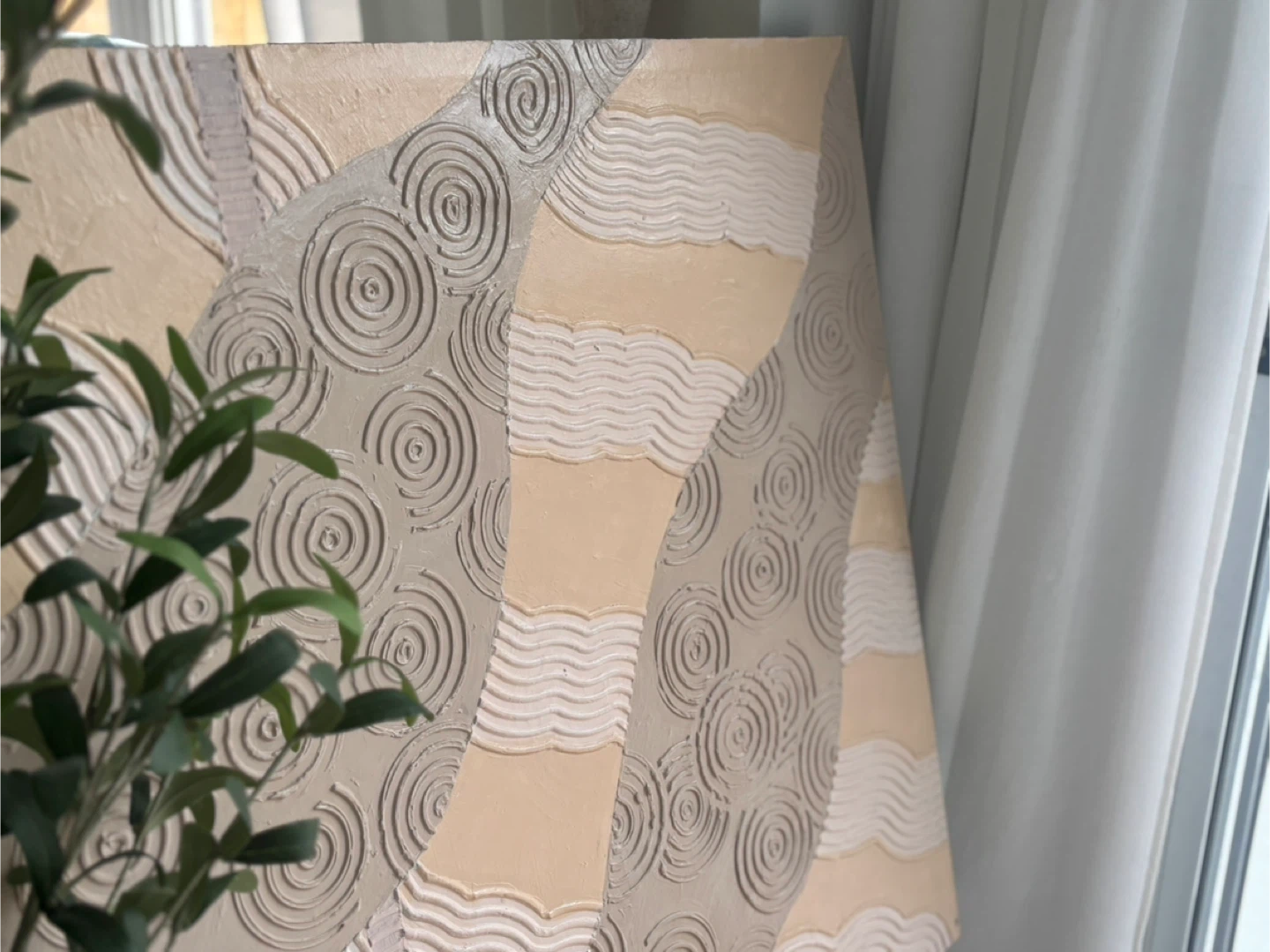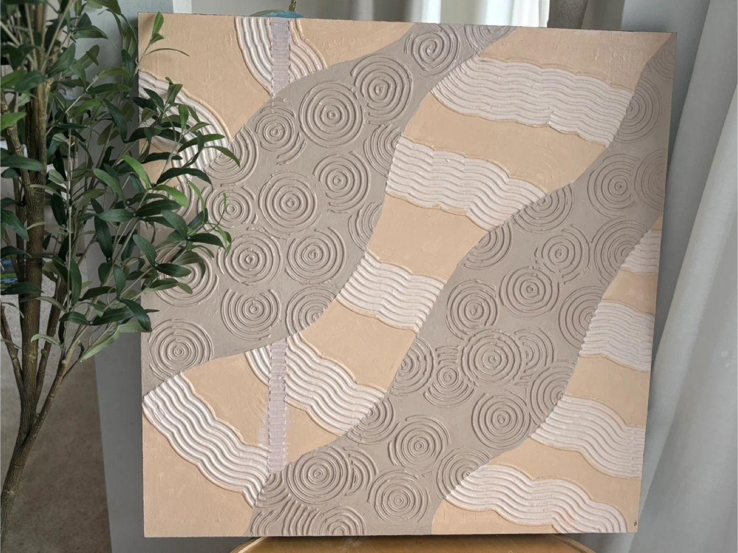 Selling a piece of textured abstract wall art. It features a unique design with raised patterns in neutral tones. It would be a lovely addition to any room!