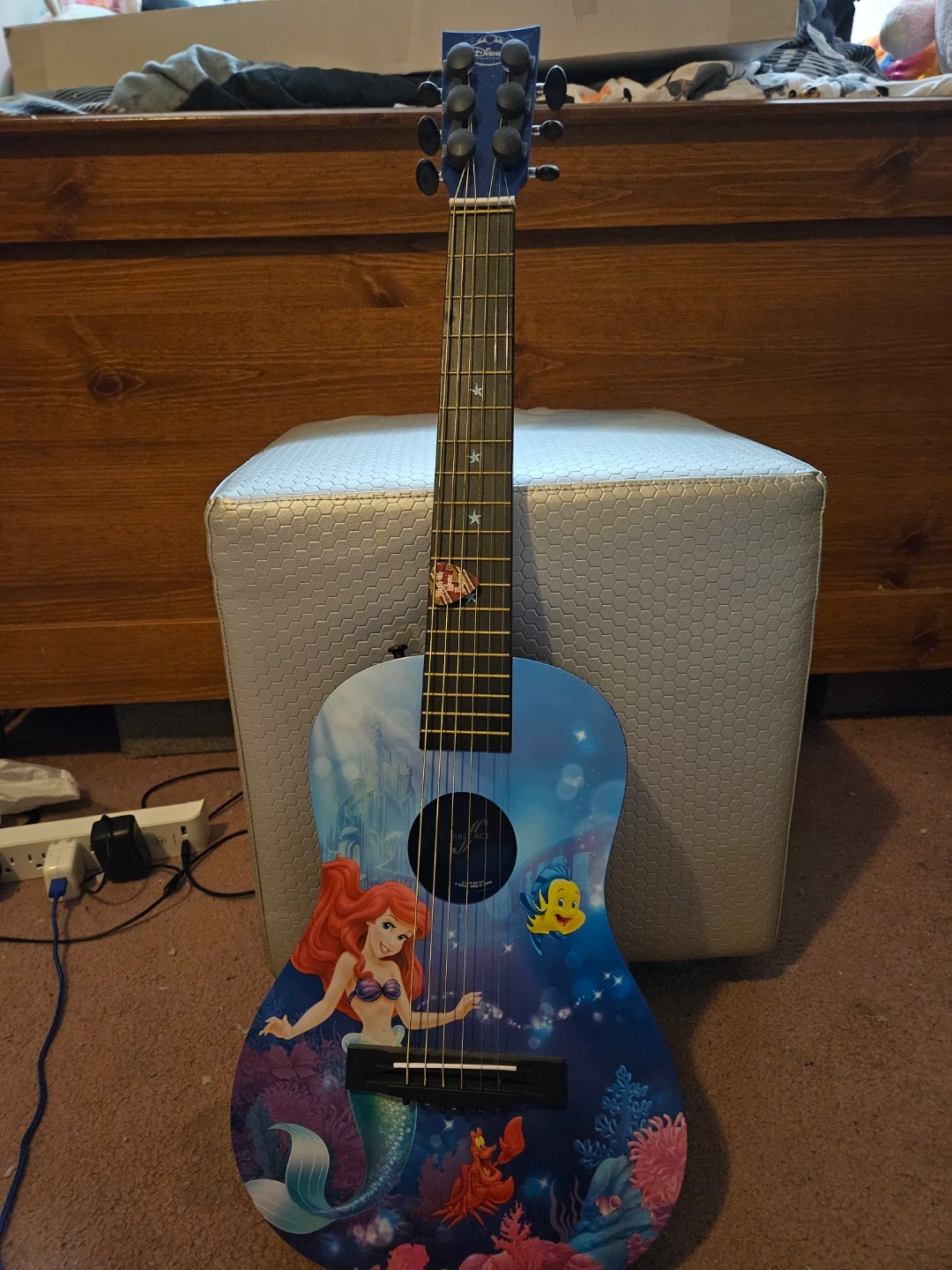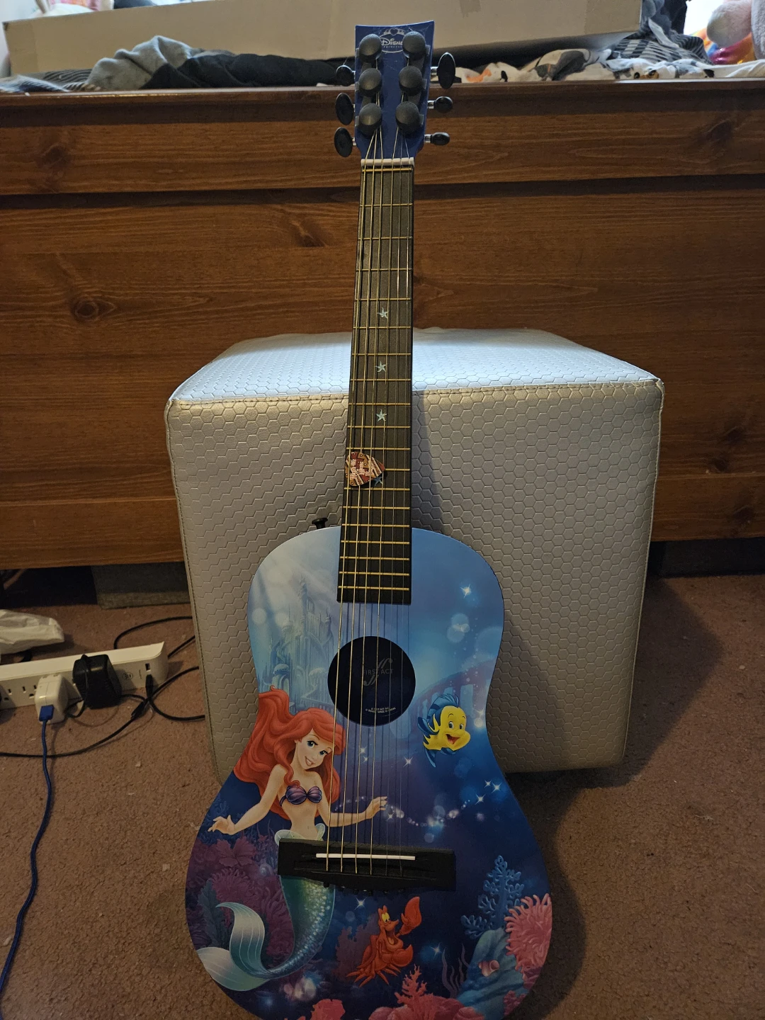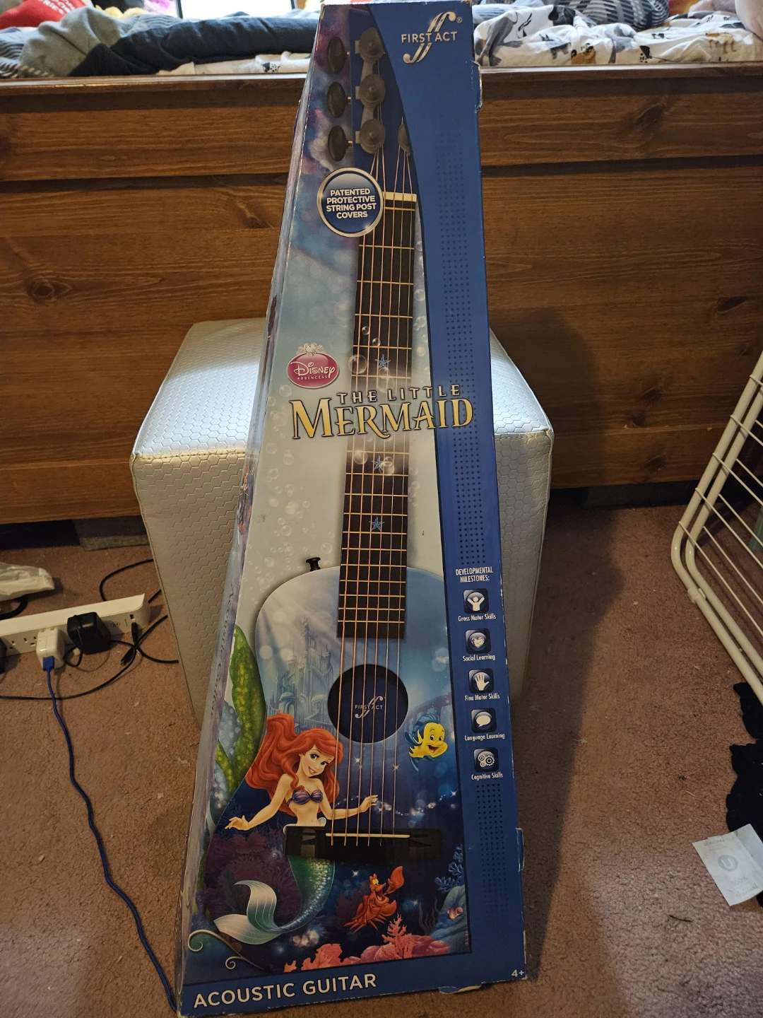 Selling a Little Mermaid acoustic guitar by First Act! It's in great shape and comes with the original box. Perfect for any young Disney fan who wants to learn to play guitar. The box has protective string covers to keep the guitar safe when not in use. It's designed to help develop gross motor skills, sound learning, fine motor skills, language learning, and cognitive skills