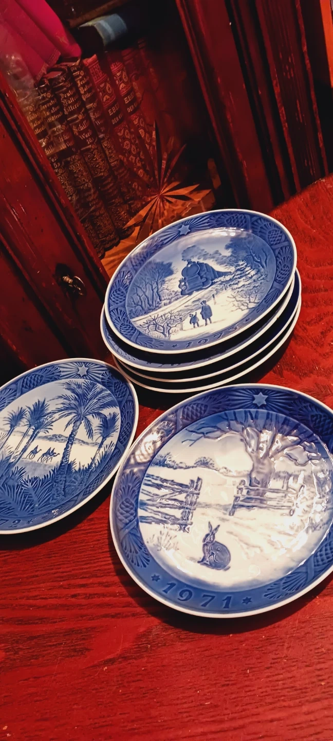 Collection of 6 ร Beautiful Royal Copenhagen Fine Porcelain Christmas Holiday Decorative ๐ Collectible Plates. They have a beautiful blue and white design and are excellent Mint condition. Years include 1971, 1972, 1973, 1975, 1961 and 1981. Made in Denmark ๐ฉ๐ฐ. BEST OFFER !!! GIVE ME YOUR OFFER FOR ALL OF THEM !! 7" diameter. $95 for 6 ร plates or best offer !!!