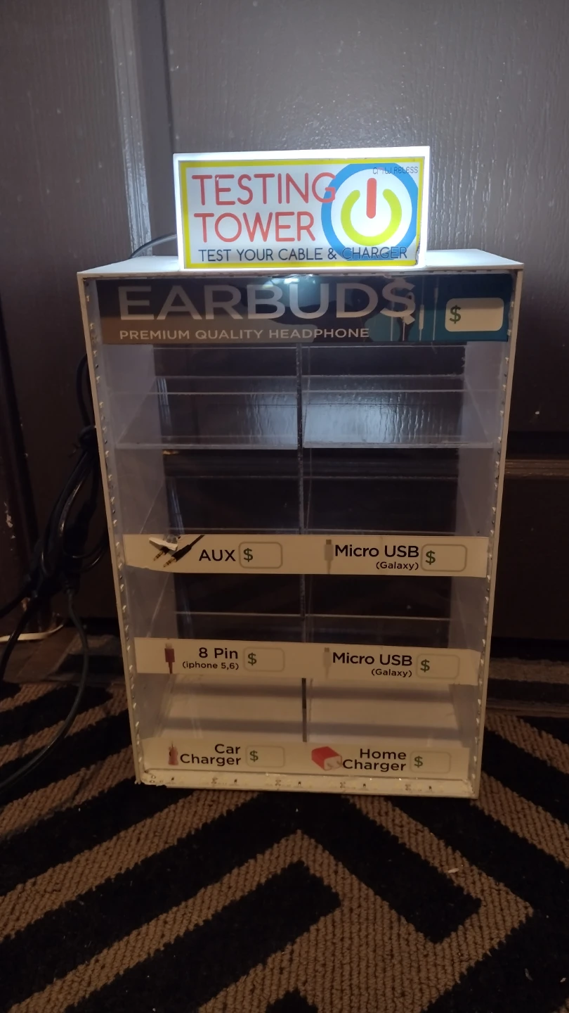 Selling an earbuds display stand, perfect for retail or personal use. It comes with a testing tower to test cables and chargers. The stand has compartments for AUX, Micro USB (Galaxy), 8 Pin (iPhone 5+), Car Charger, and Home Charger. $40 each