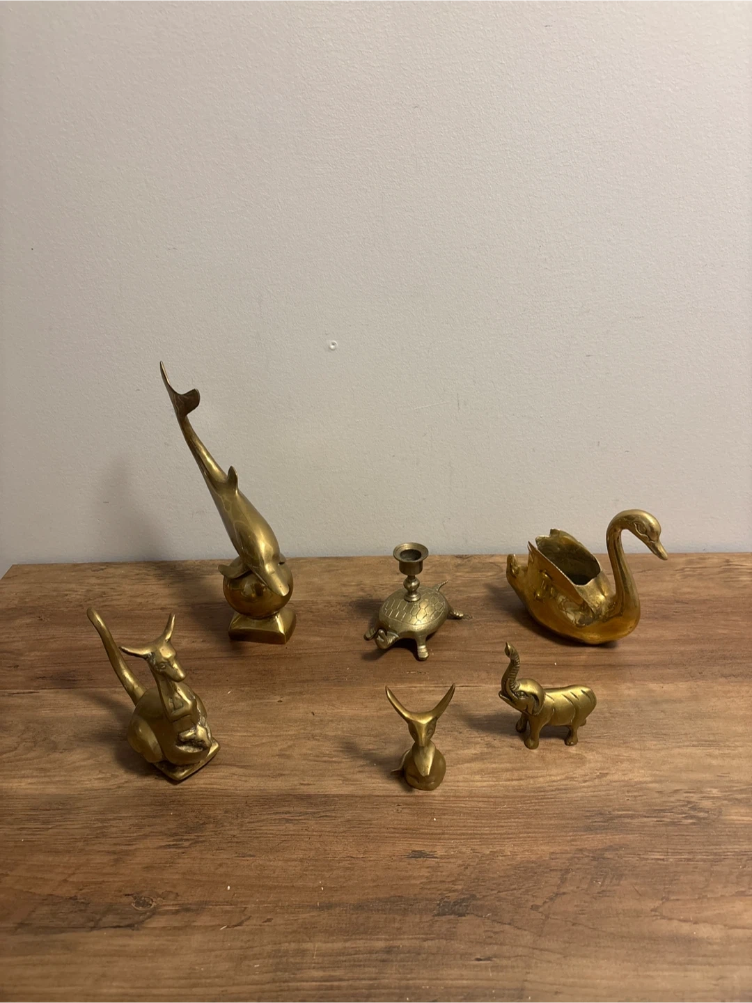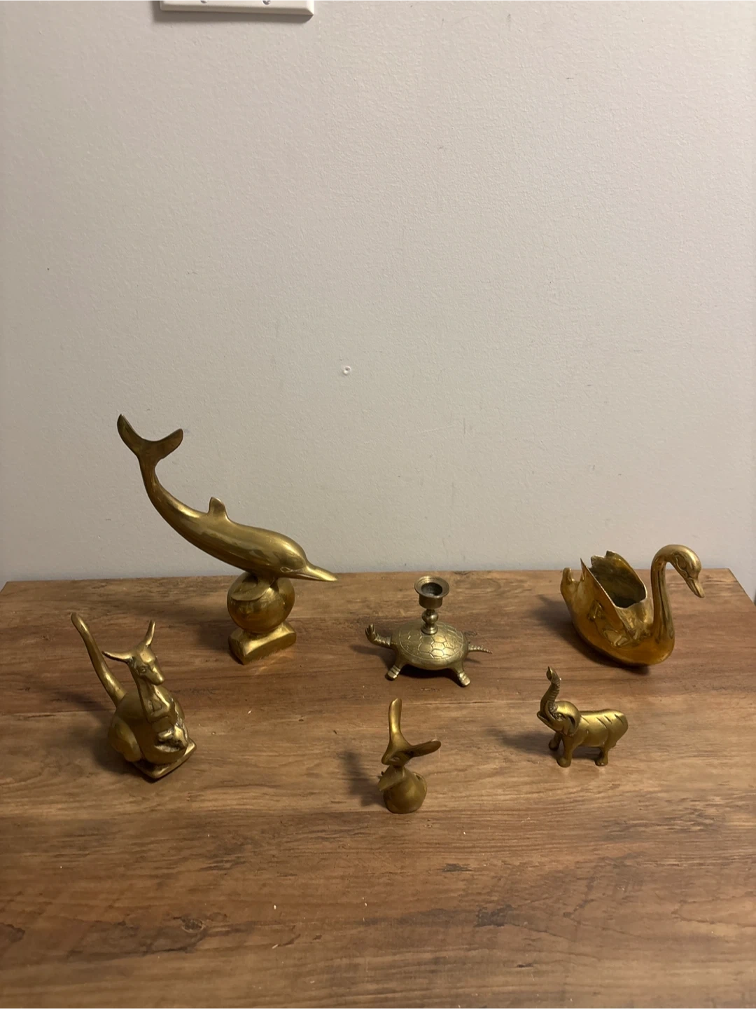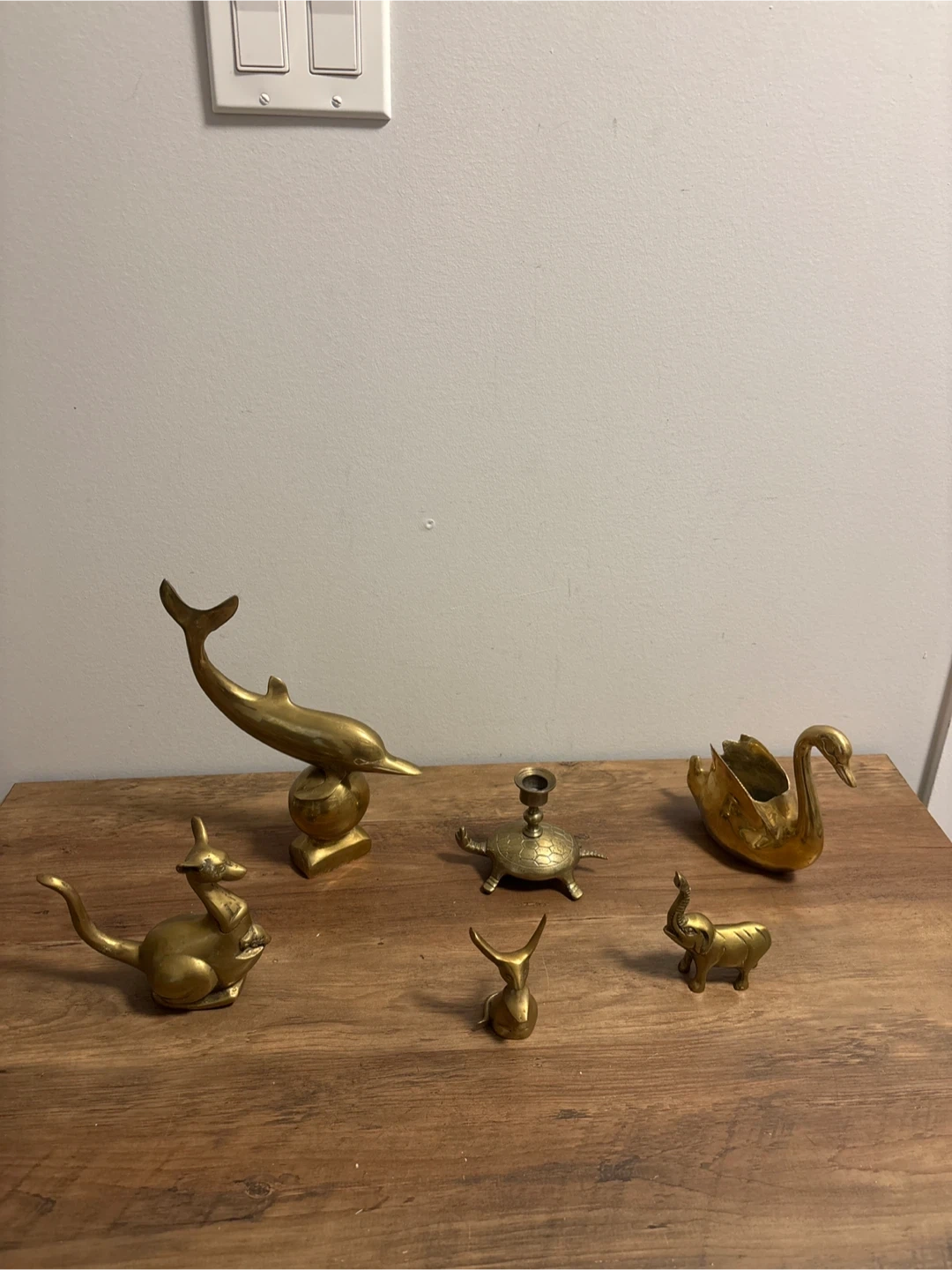 Selling a set of six cute brass animal figurines! Includes a dolphin, kangaroo, swan, elephant, turtle, and deer. They're in great shape and would look lovely on a shelf or desk