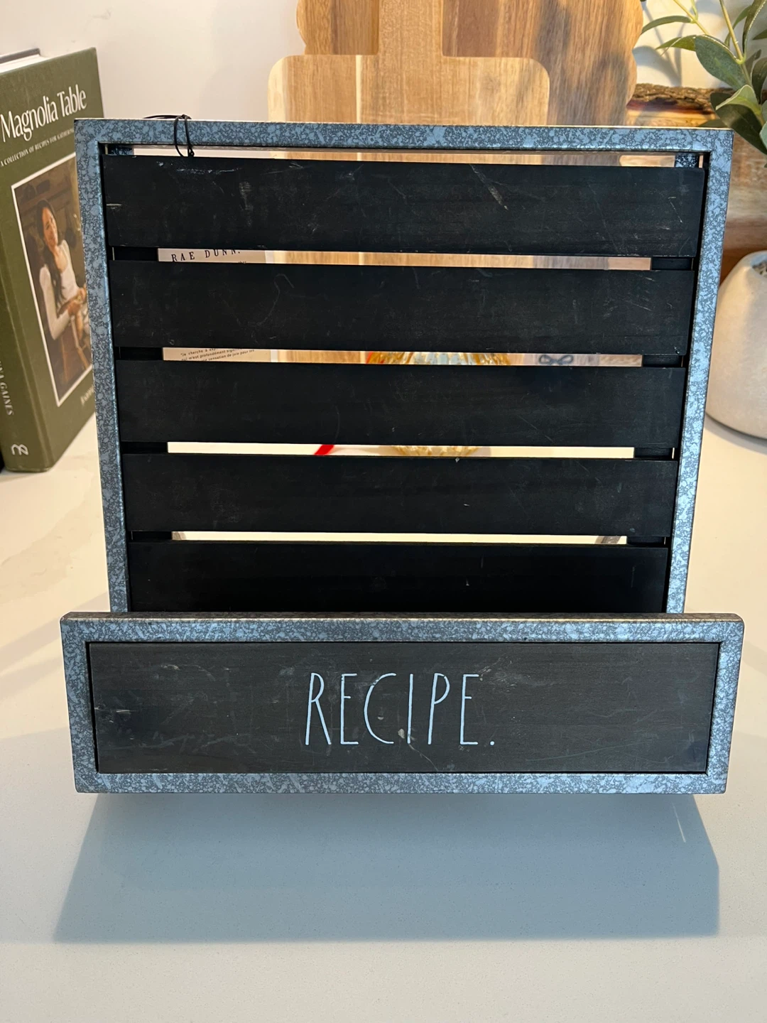 Selling a Rae Dunn recipe holder from the Kitchen Collection! It's perfect for keeping your recipes organized while you cook. The holder has a chalkboard-style front where you can write the recipe name