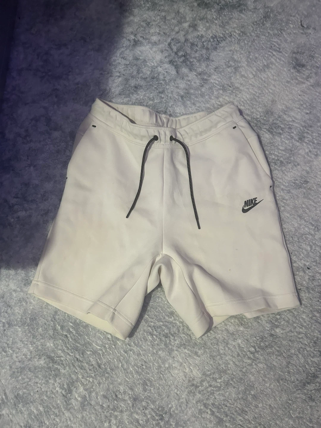 Selling a pair of Nike Tech Fleece shorts in a cream colour. They're in great condition and super comfy for everyday wear! The shorts feature the Nike logo and a handy zip pocket on the back