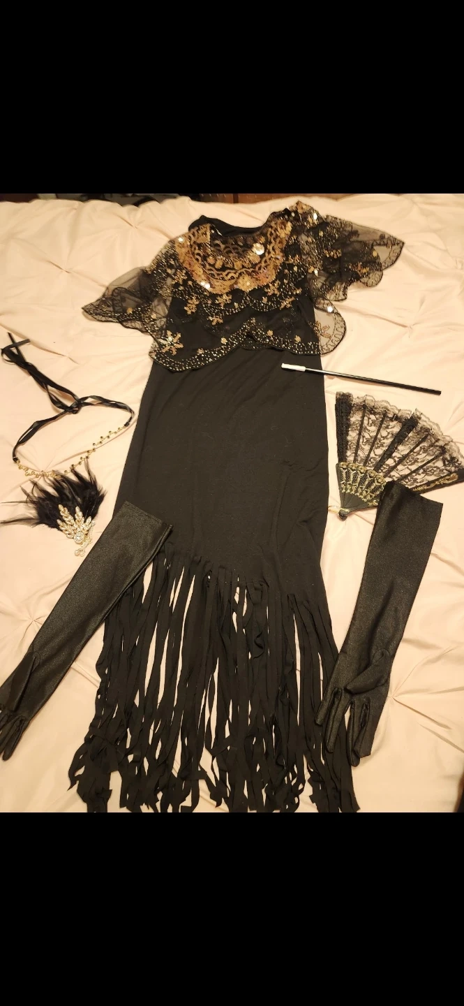 Selling a complete flapper dress costume, perfect for a themed party or event! It comes with all the accessories you see in the pictures, including a fan, gloves, and a headband. The dress is black with gold accents and has a fringed bottom. It's in great condition and ready to wear! Worn once. SIZE L