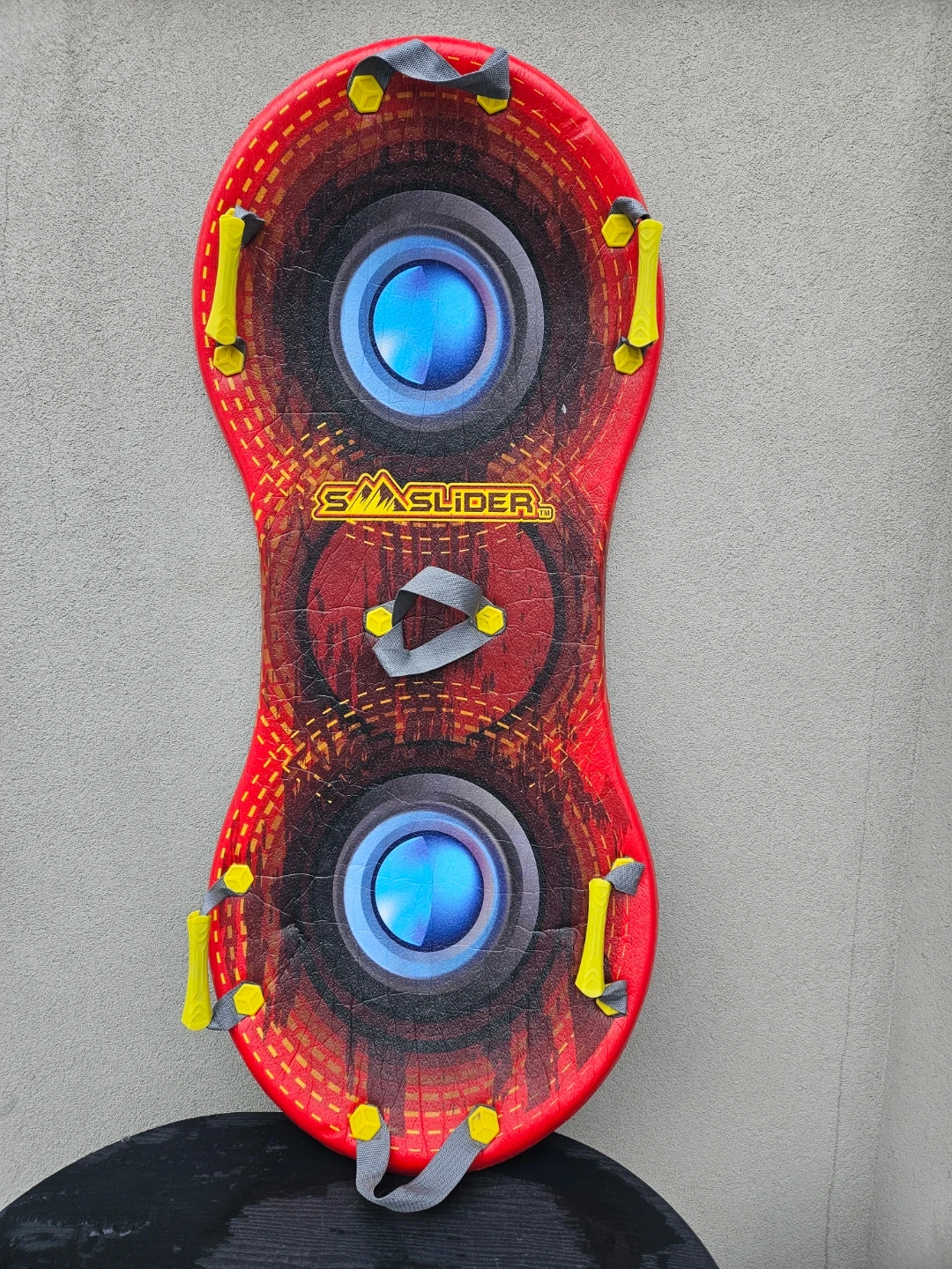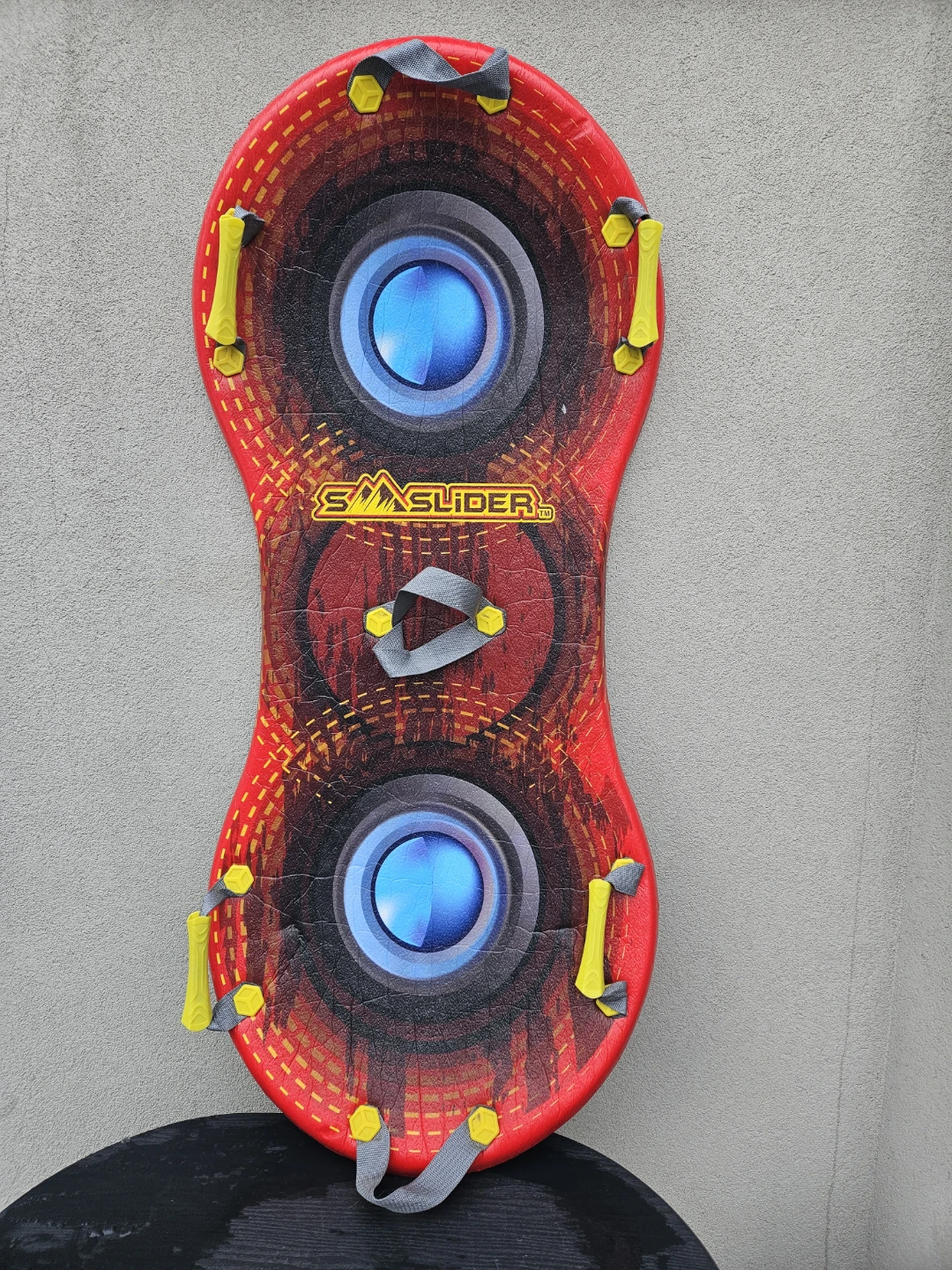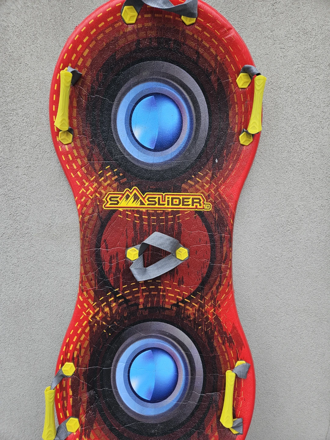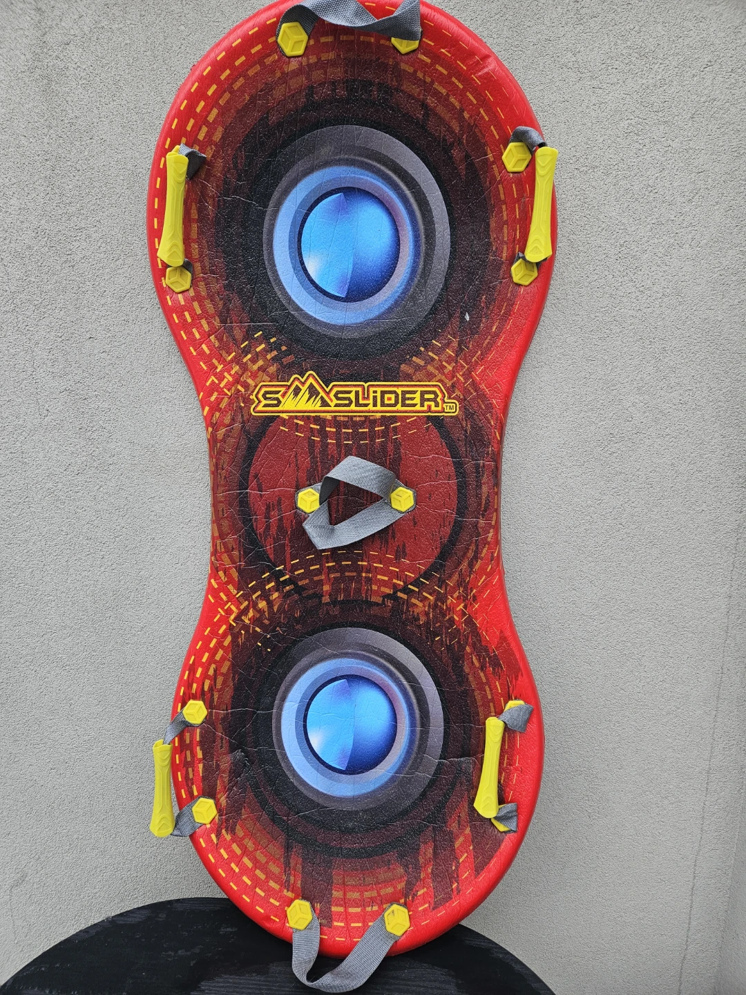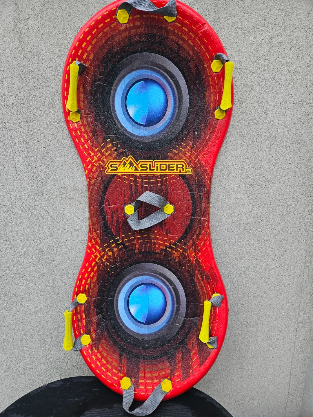 Get ready for some winter fun with this SAS Slider snow sled! It features a unique design with blue accents and yellow handles. Perfect for kids and adults alike!