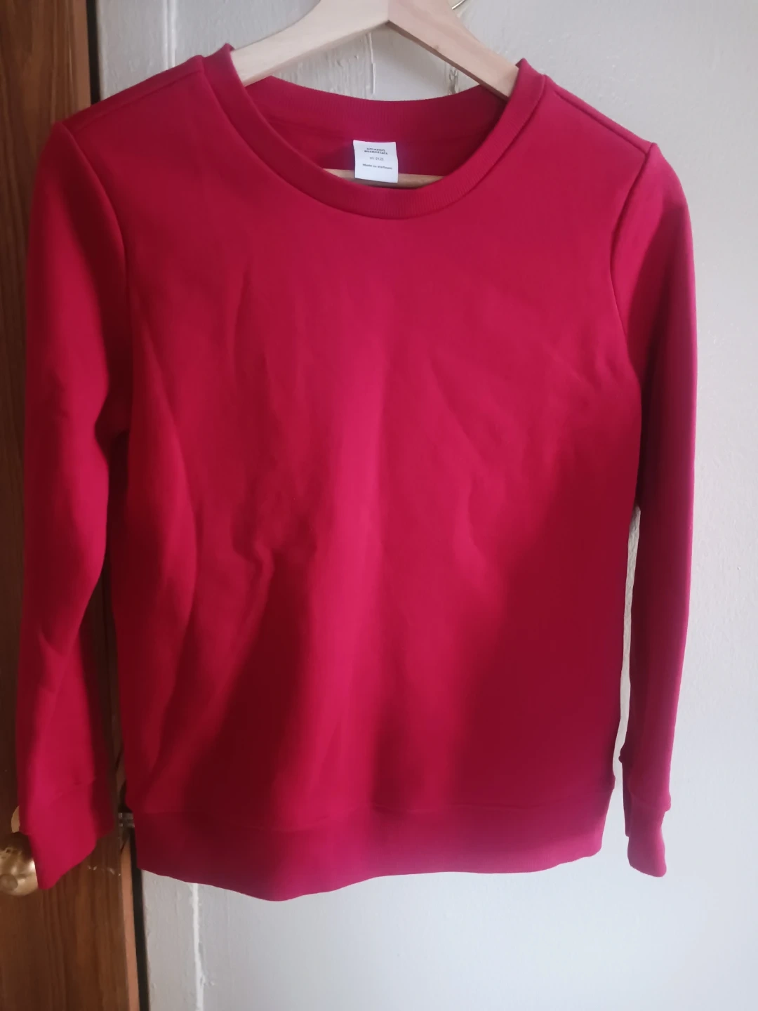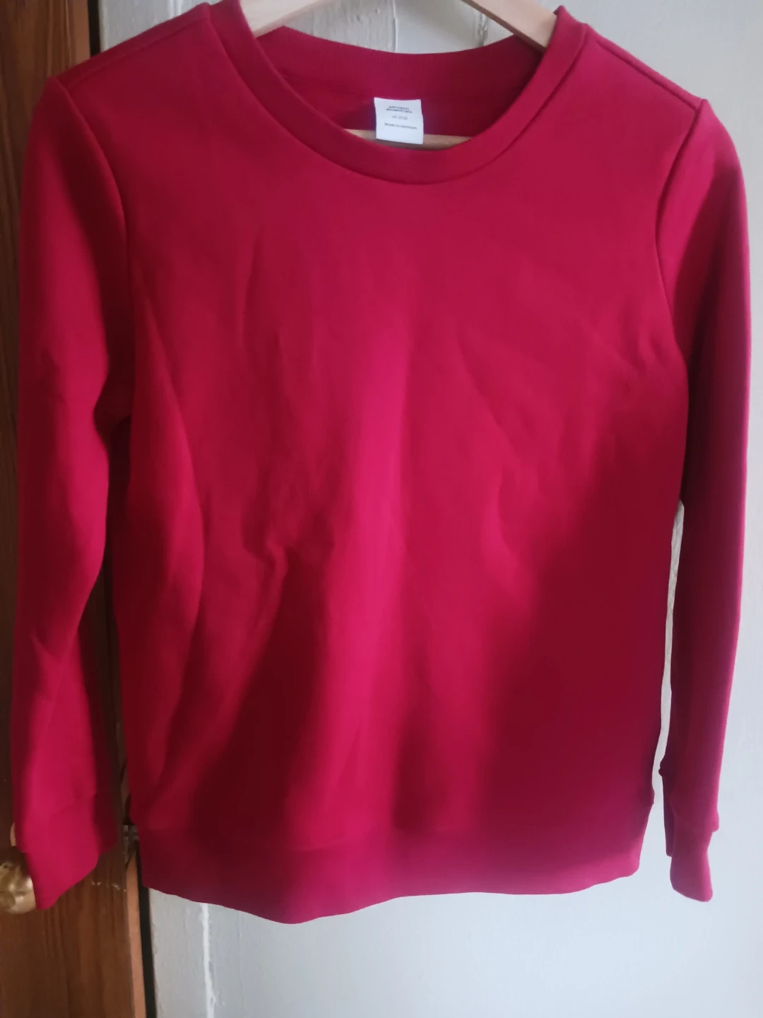 Here's a red crewneck sweatshirt in size small! It's a vibrant color and in great condition. Perfect for layering or wearing on its own