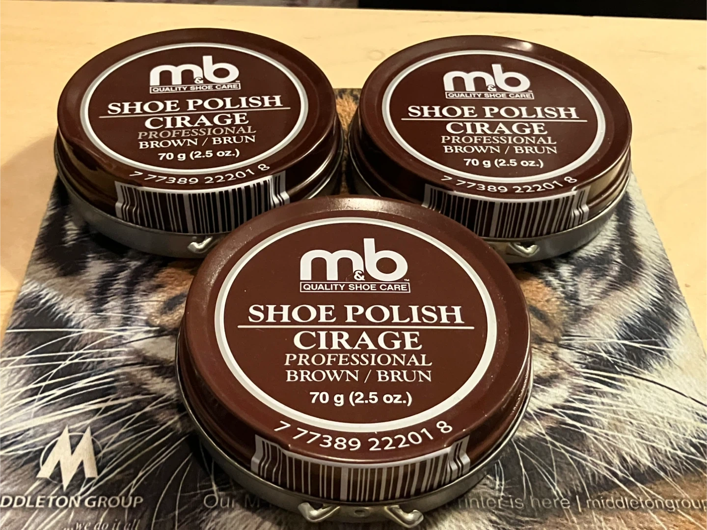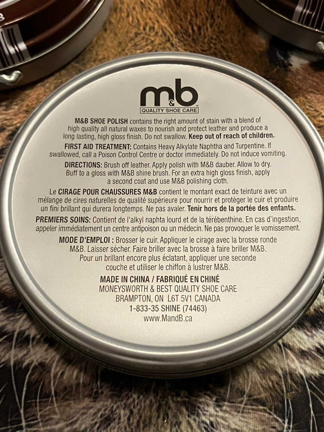 Selling three tins of MB Quality Shoe Care shoe polish in professional brown! Each tin contains 70 g (2.5 oz) Perfect for keeping your leather shoes looking their best all 3 for $10