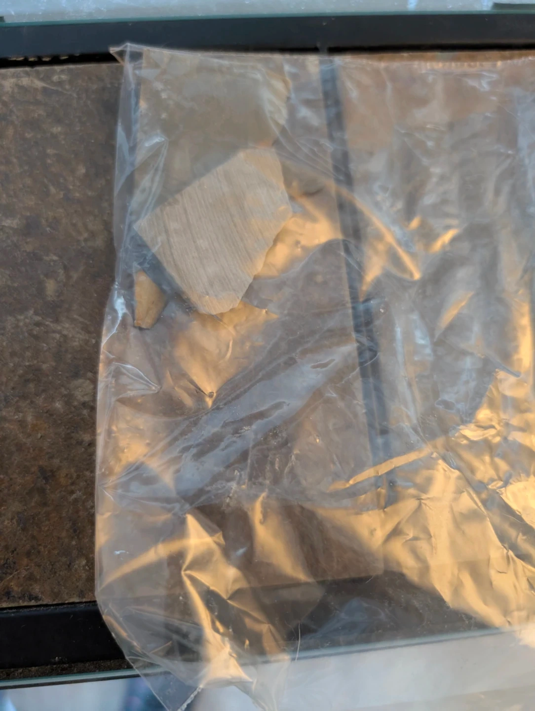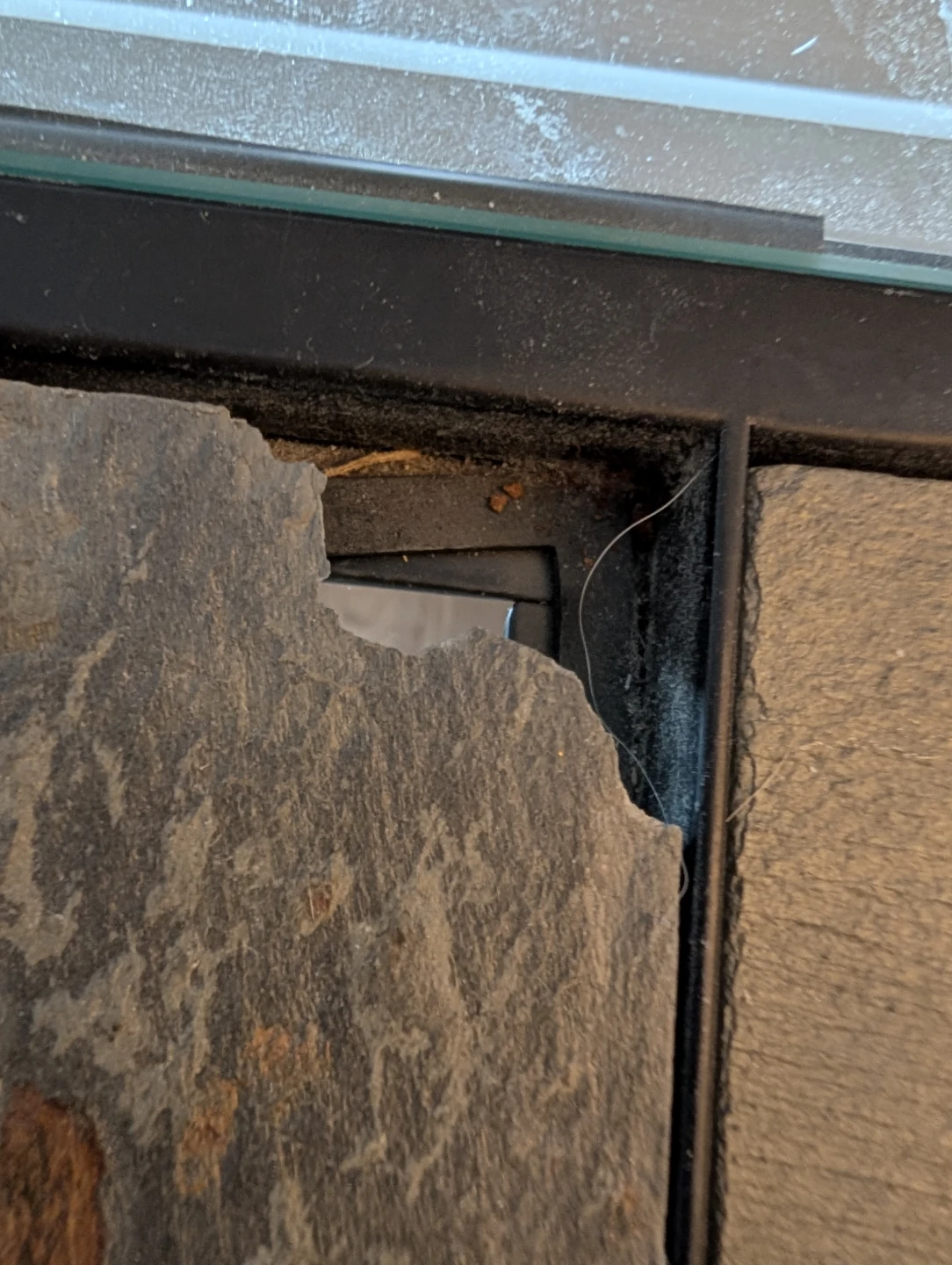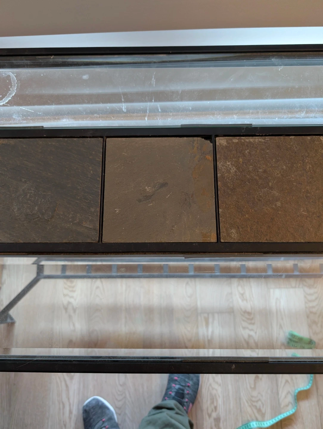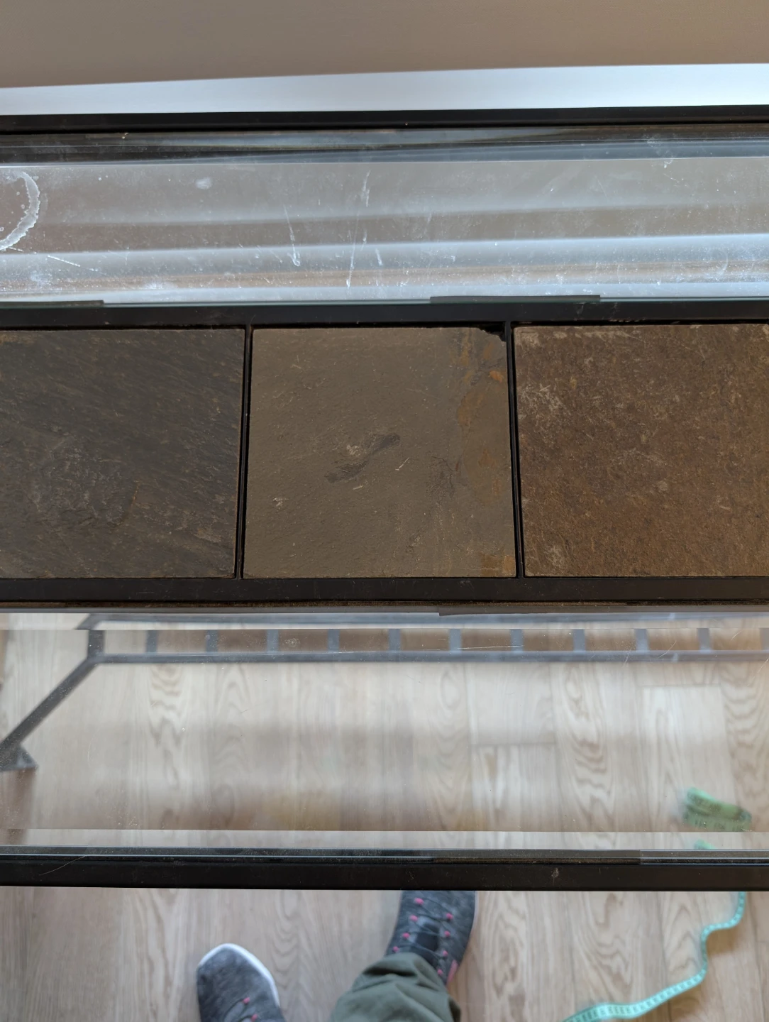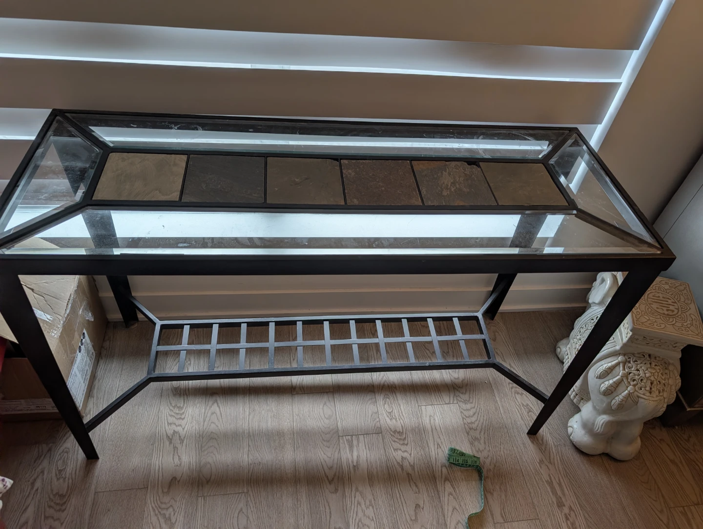 Selling a sofa table with a glass top and slate tile inserts. There is some damage to the slate, as shown in the pictures. The frame is black metal. Slate pieces in on bag