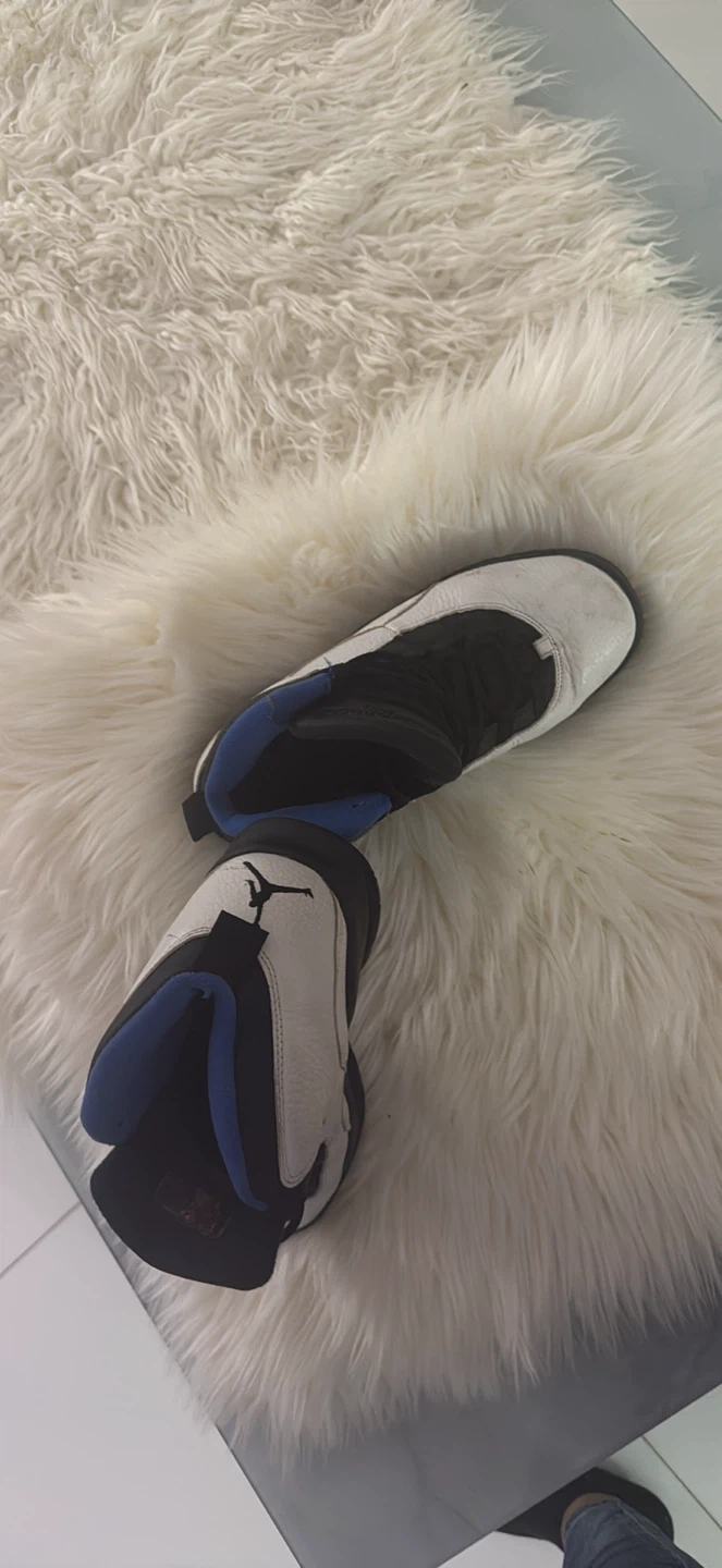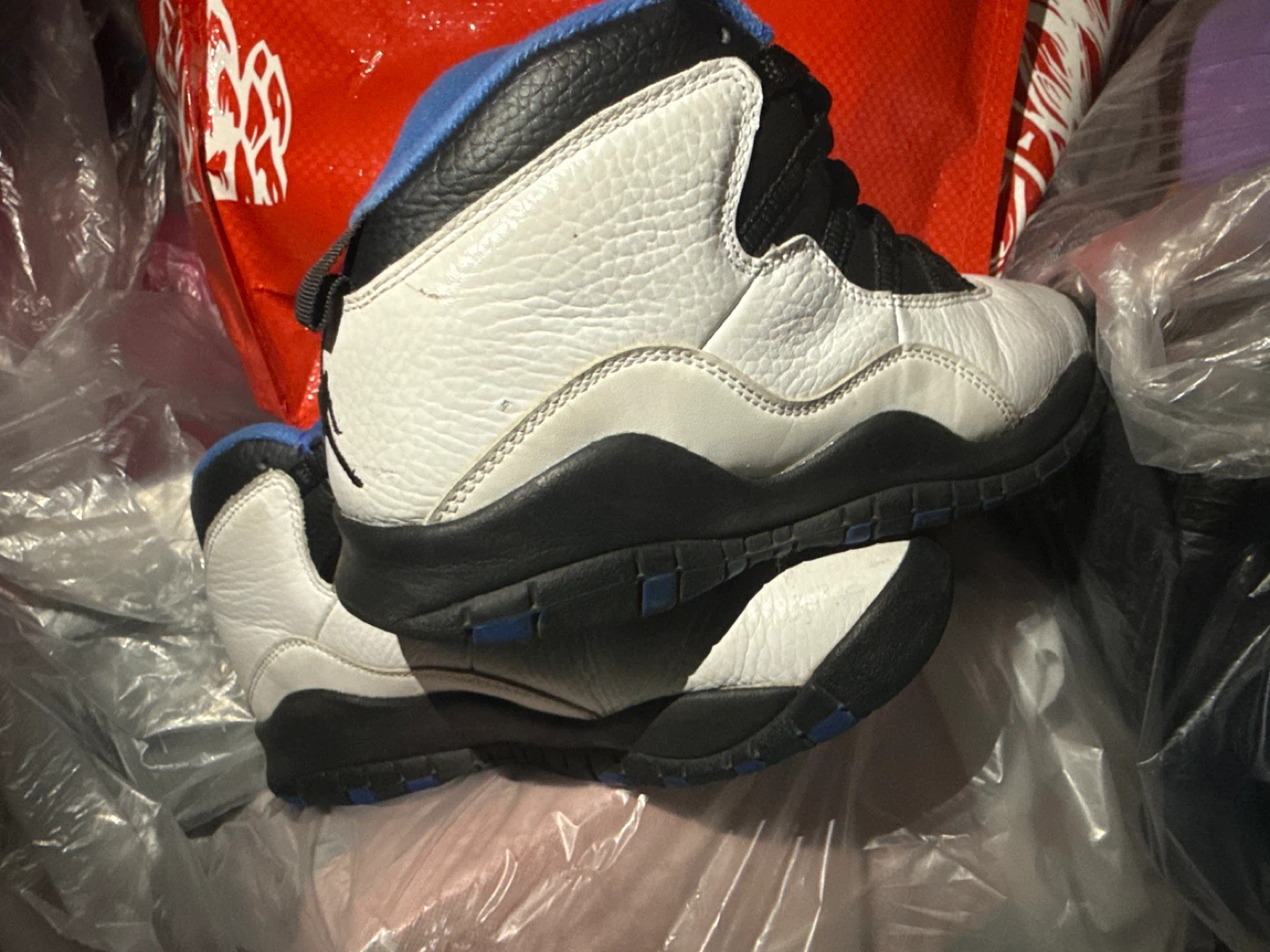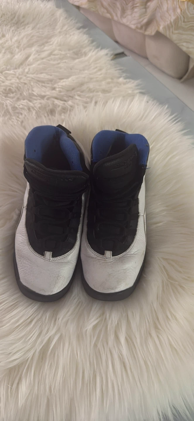 Selling a pair of Air Jordan 10 Retro in the Orlando colorway! These shoes are in used condition, as you can see from the photos. They feature a white leather upper with black accents and royal blue lining. The iconic Jumpman logo is on the heel