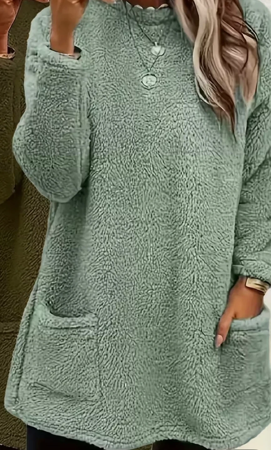 Cozy up in this adorable Winter Thermal Teddy Fleece fuzzy long sleeve sweater! It's a lovely sage green colour and features handy pockets. Perfect for lounging at home or a casual day out.