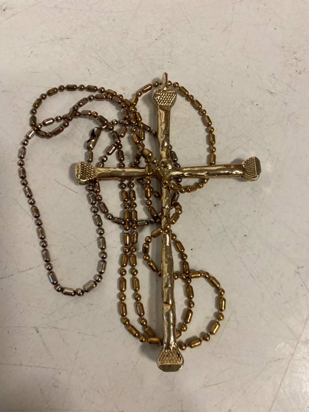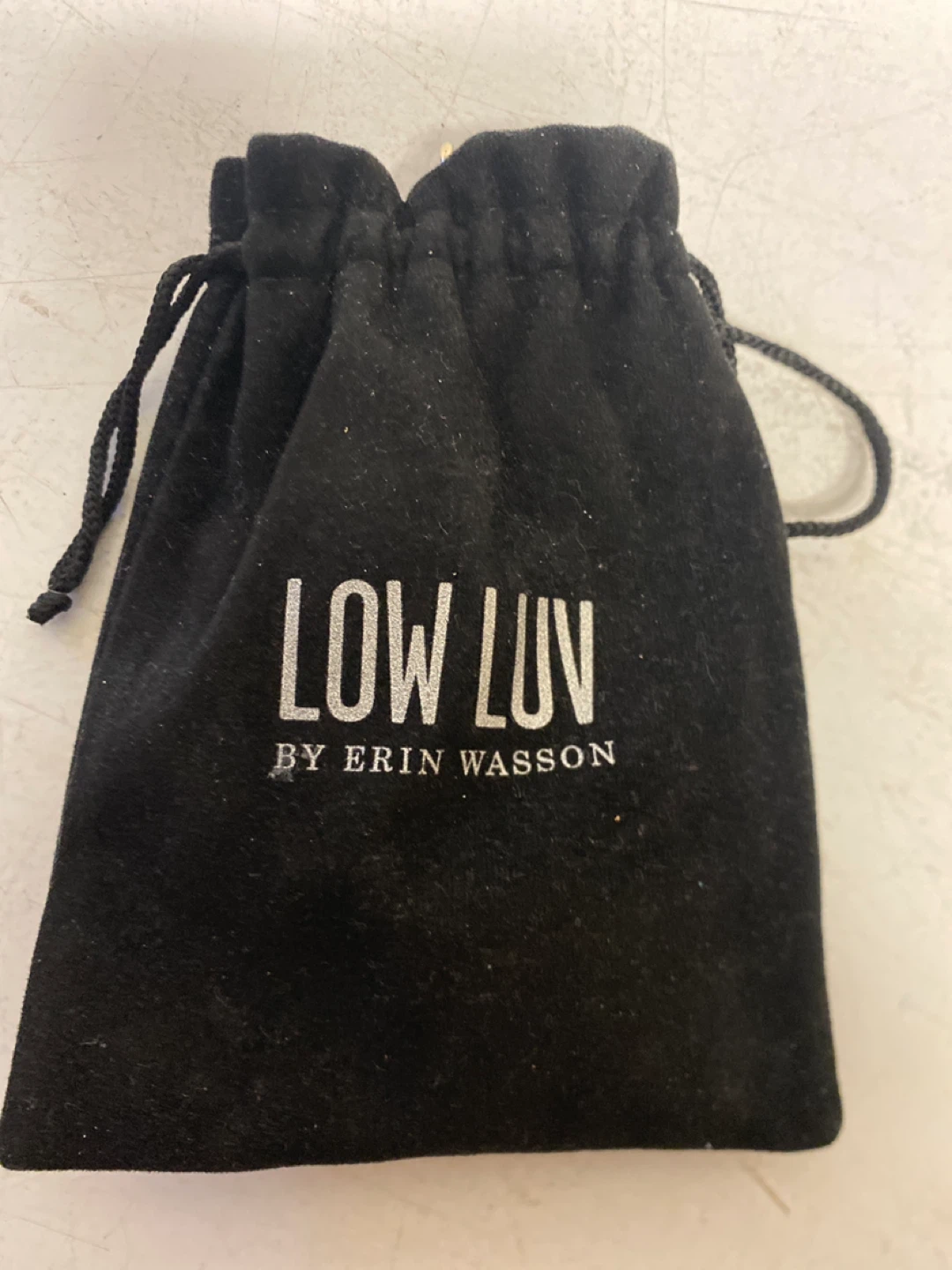 LOW LUV by Erin Wasson cross necklace. It comes in a black drawstring bag. The necklace is a mix of gold and silver coloured beads with a gold cross pendant