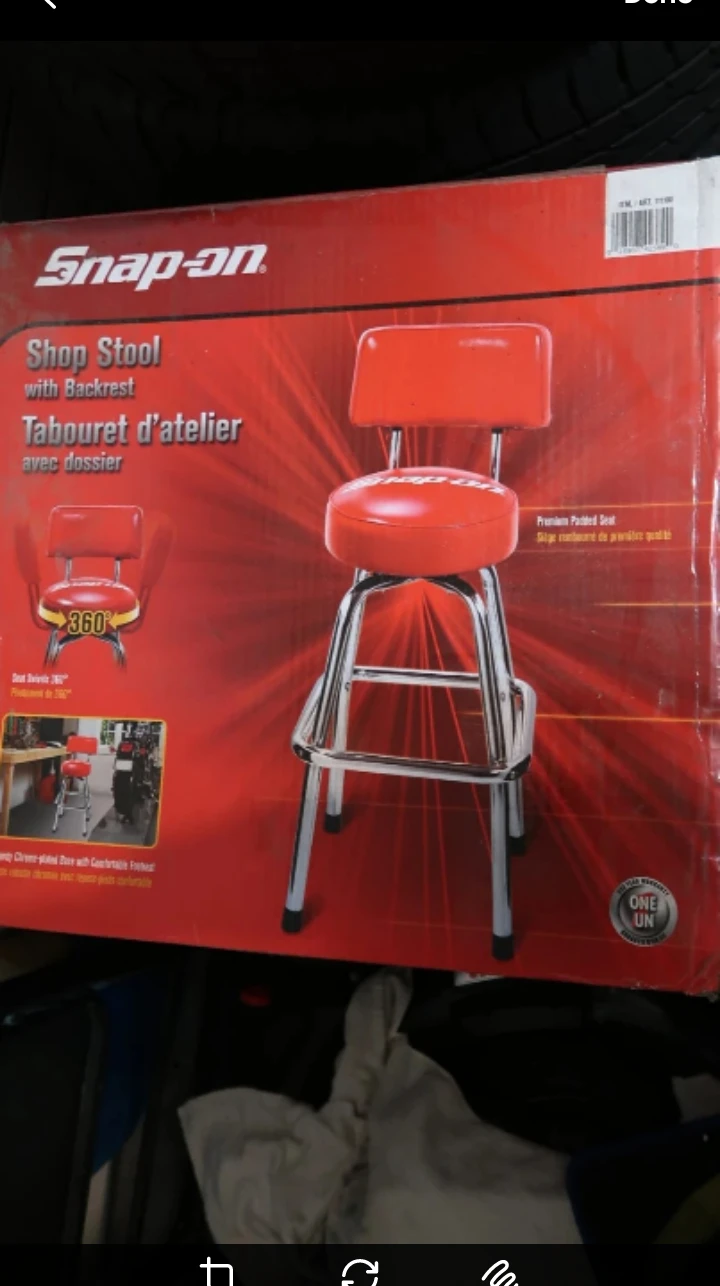 Selling a brand new Snap-on shop stool with backrest still in its original box! This stool features a premium padded seat and a 360-degree swivel. The box shows an image of the stool with a bright red seat and chrome frame. It's ready to assemble and add some style to your workspace