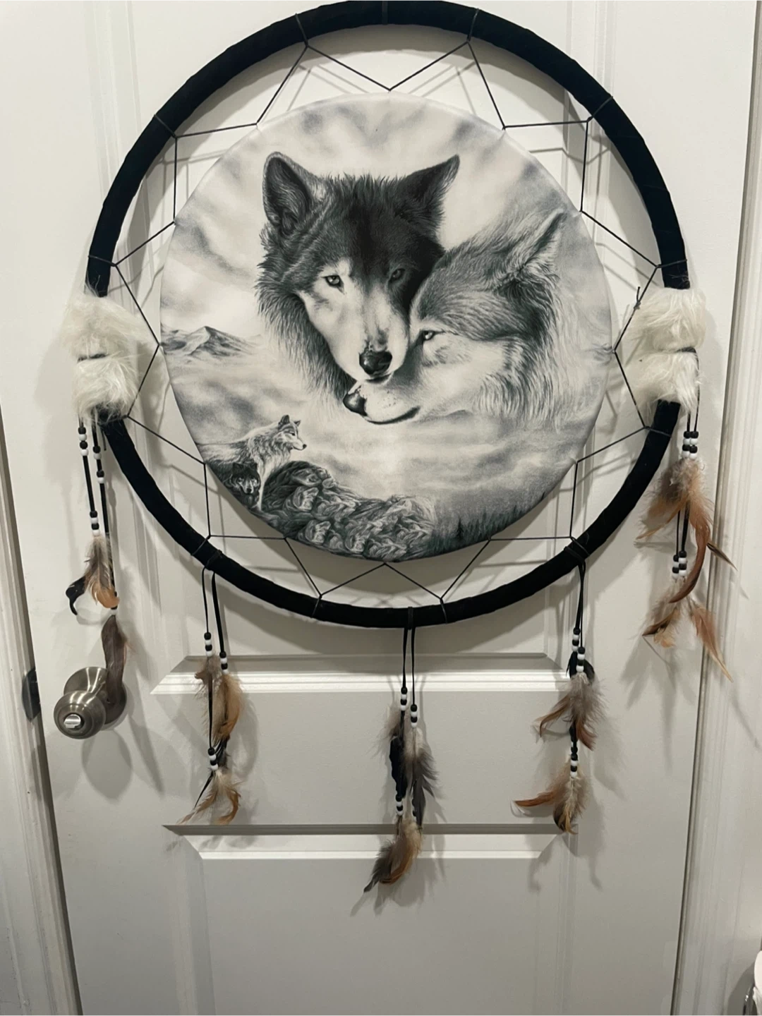 Here's a lovely dream catcher featuring a wolf design! It's in great condition and would be a nice addition to any room.