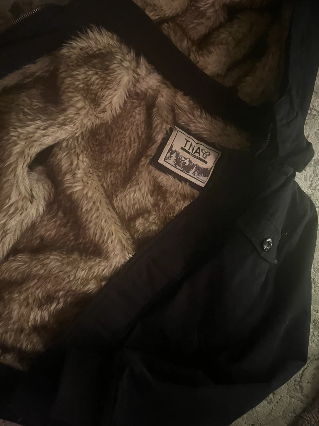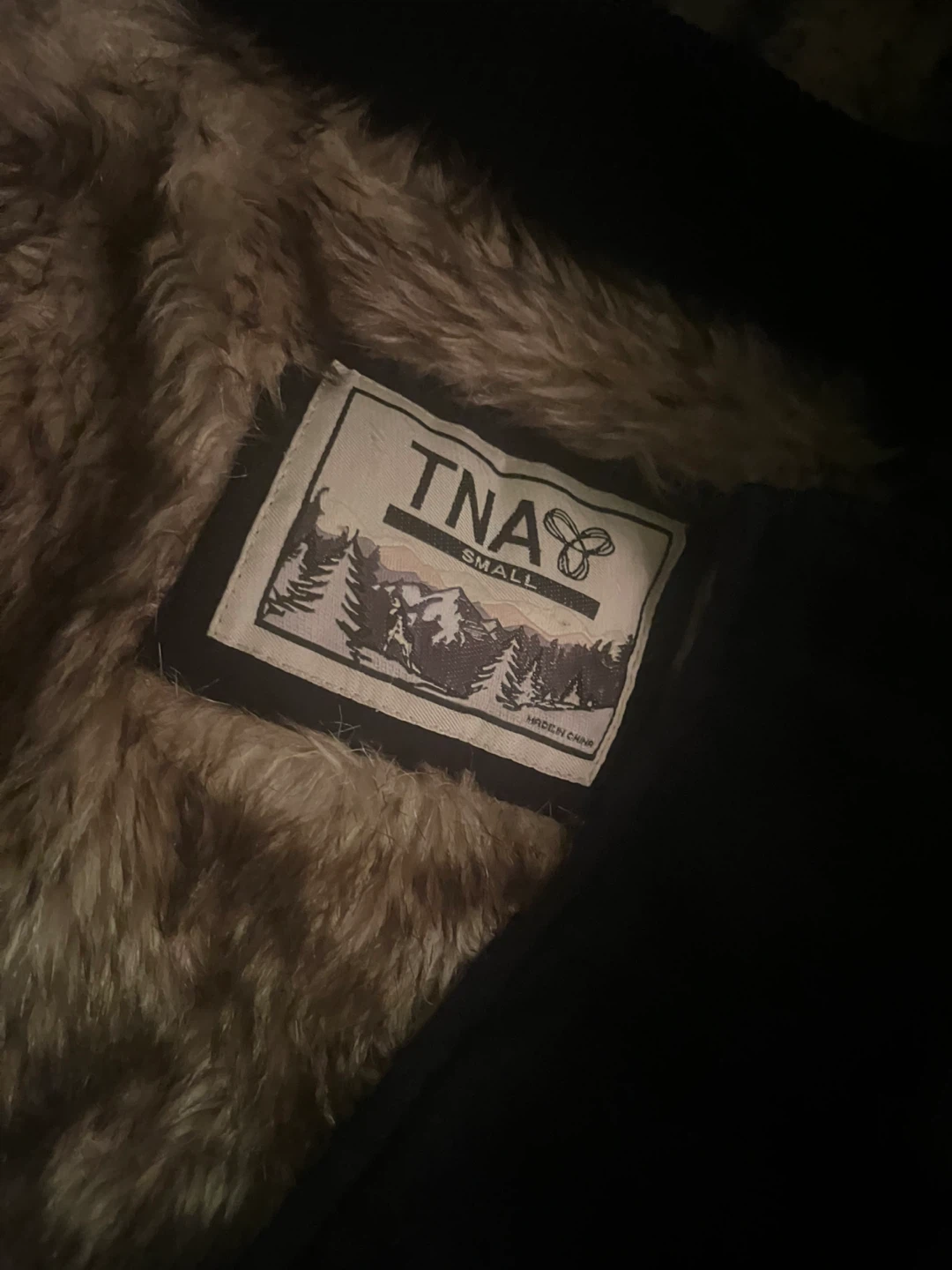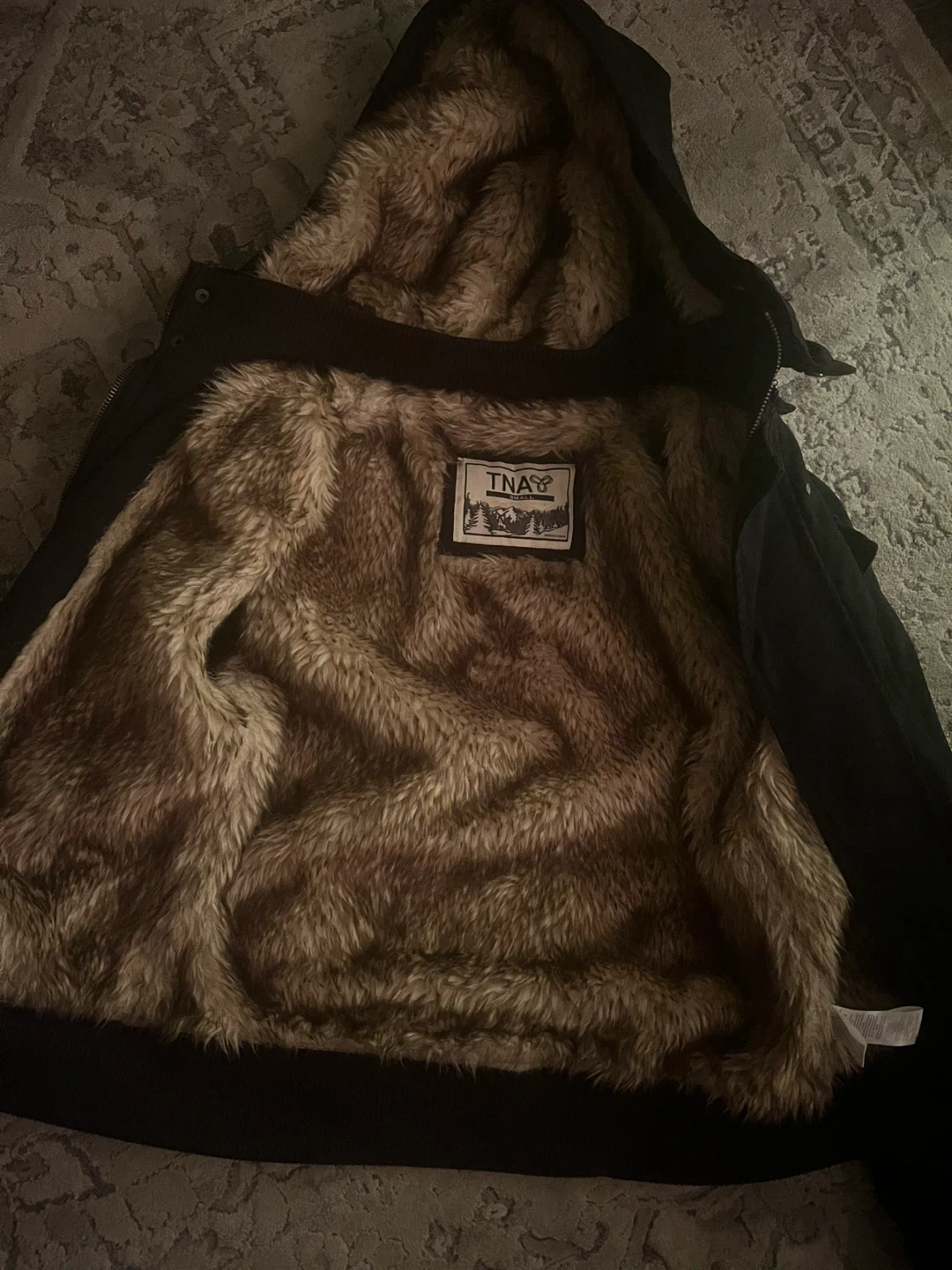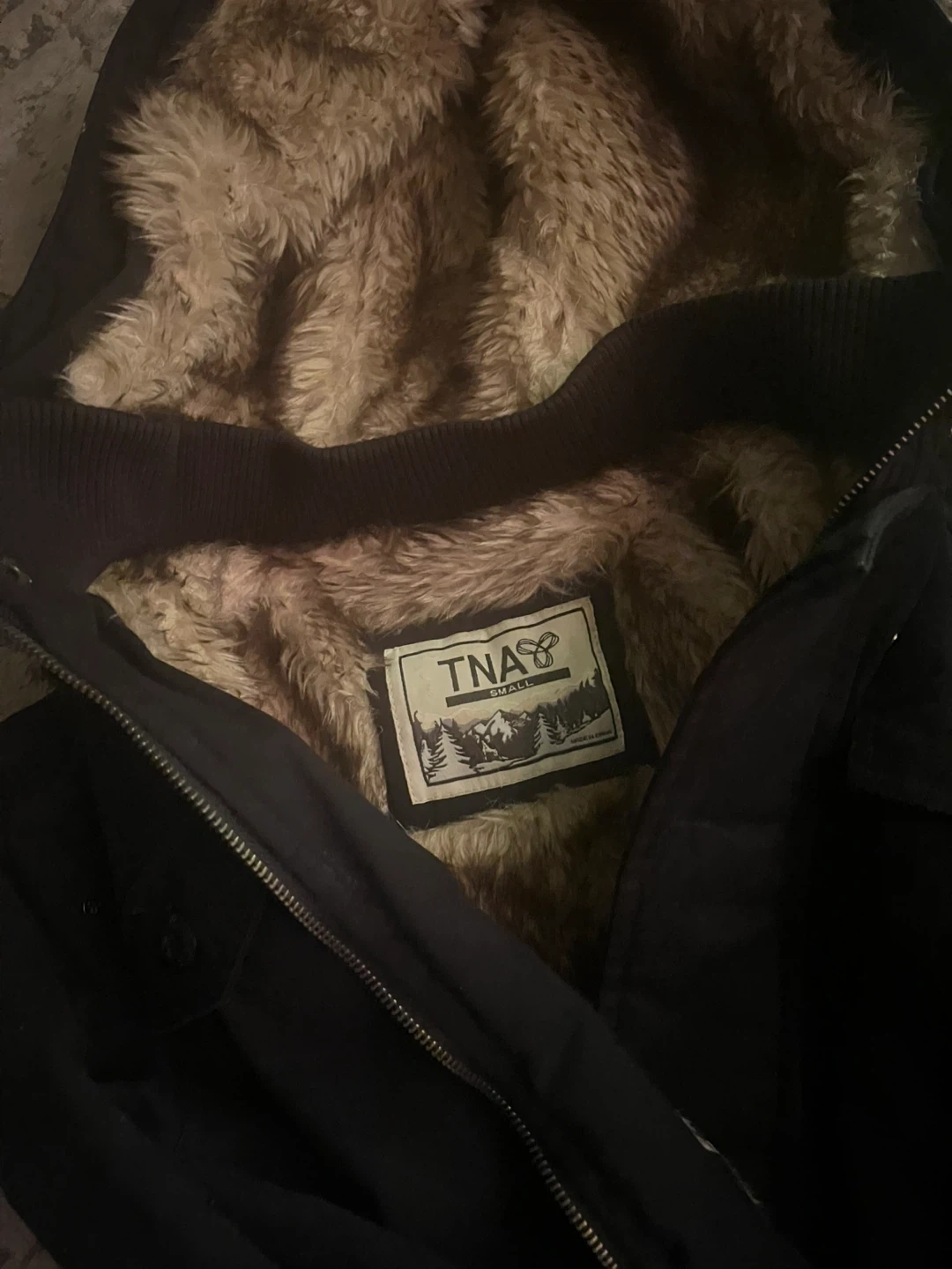 Black TNA jacket with soft faux fur lining inside and hood. Super warm, cozy, and perfect for cold weather. In great condition.