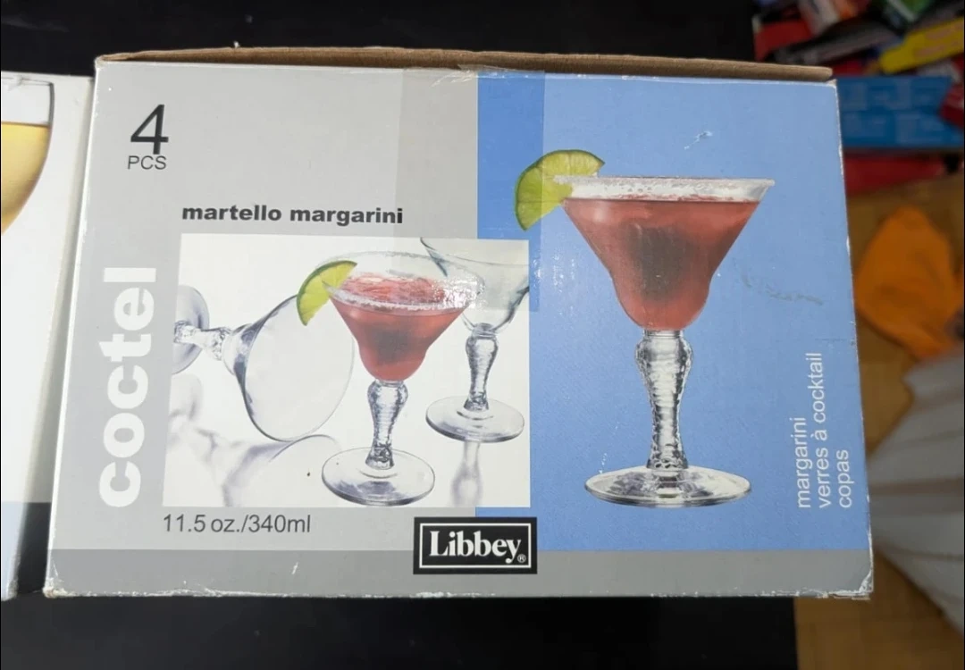 Selling a set of 4 Libbey Martello Margarini cocktail glasses! These glasses are perfect for margaritas or any cocktail. Each glass holds 11.5 oz / 340 ml. The box is included.