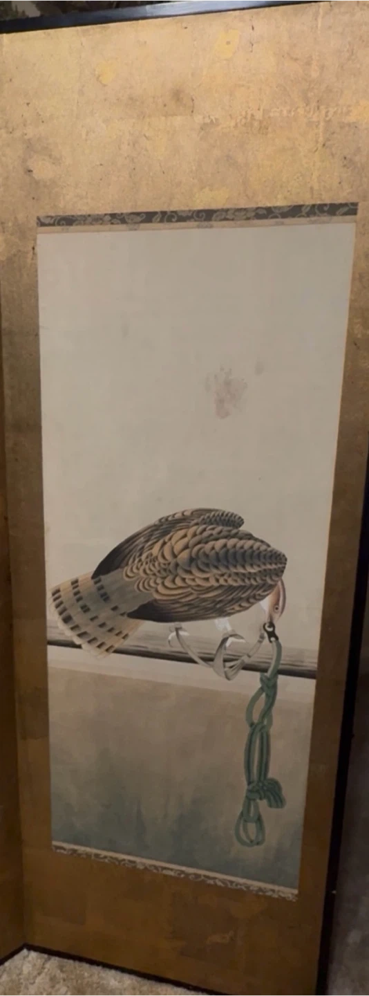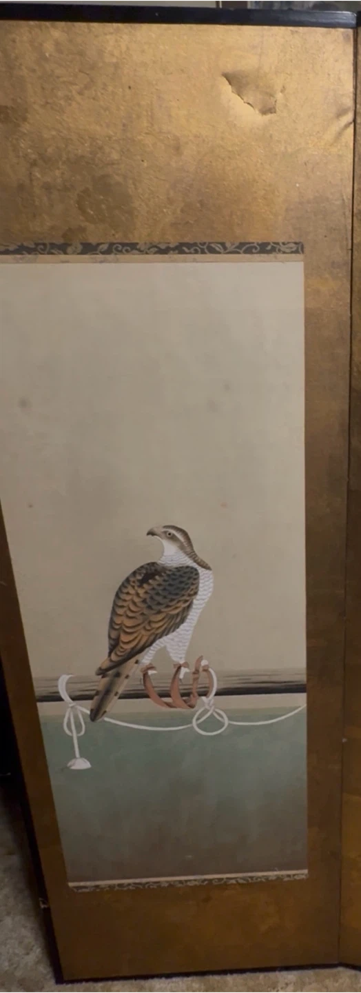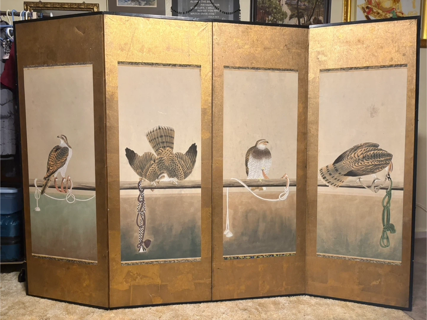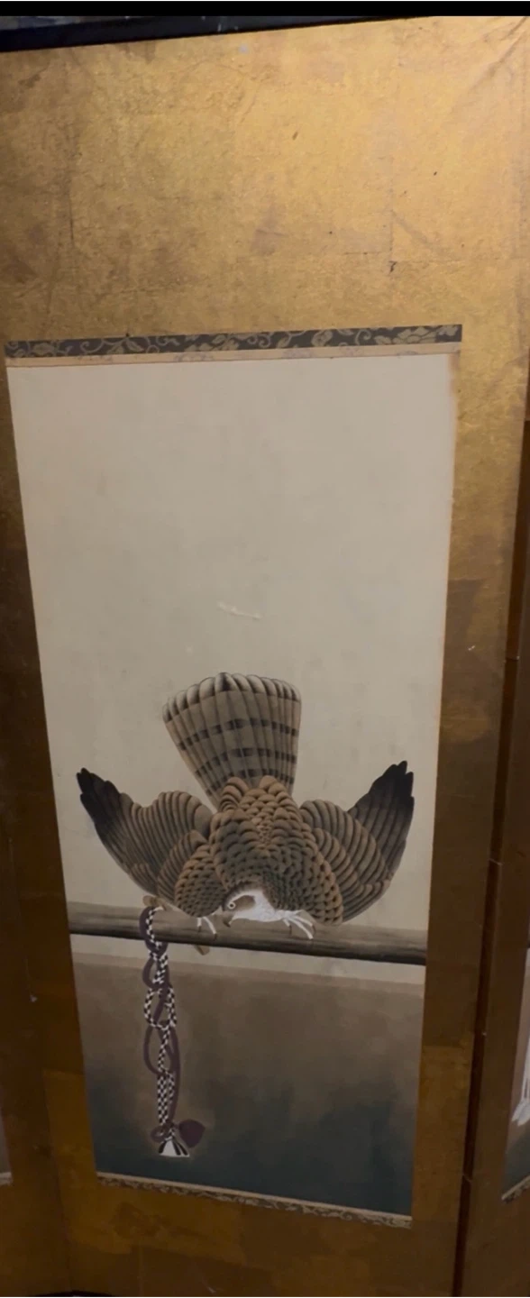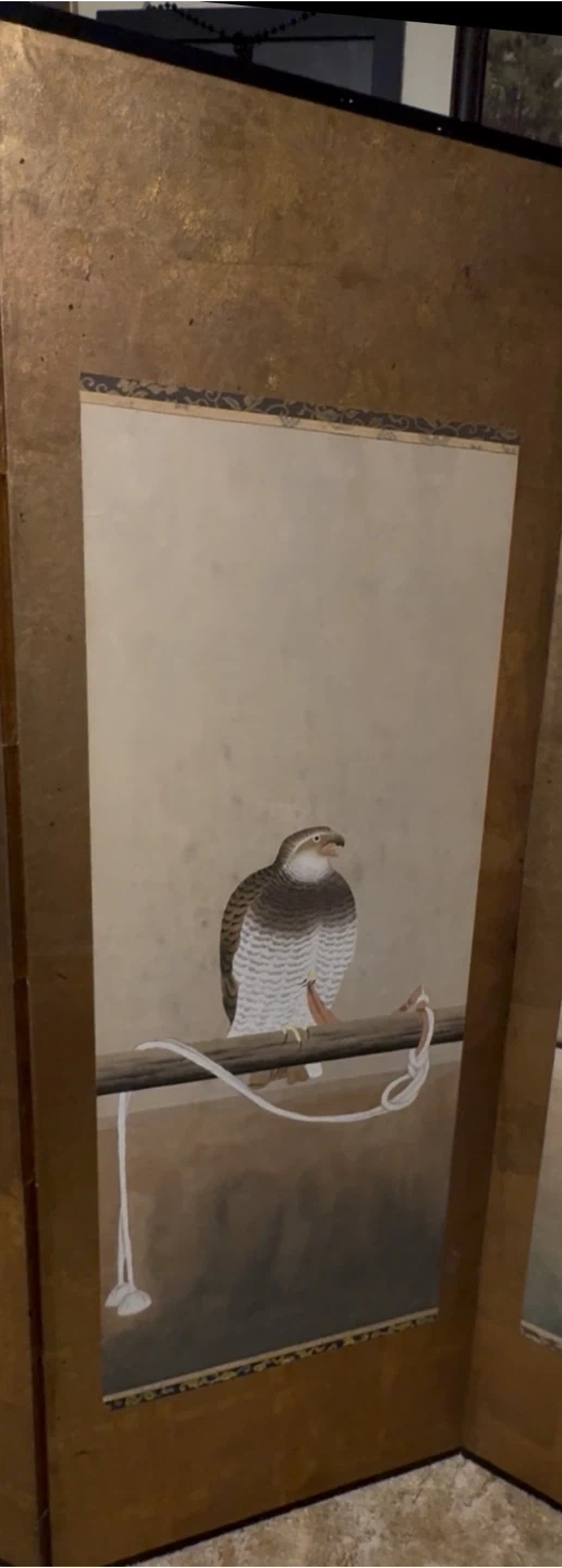 This is a Japanese four-panel folding screen (byobu) featuring hand-painted falcons perched on stands, done in a traditional style with gold leaf borders and decorative knots. It is mainly used as a decorative room divider or art accent.