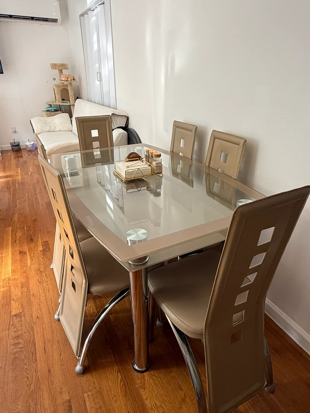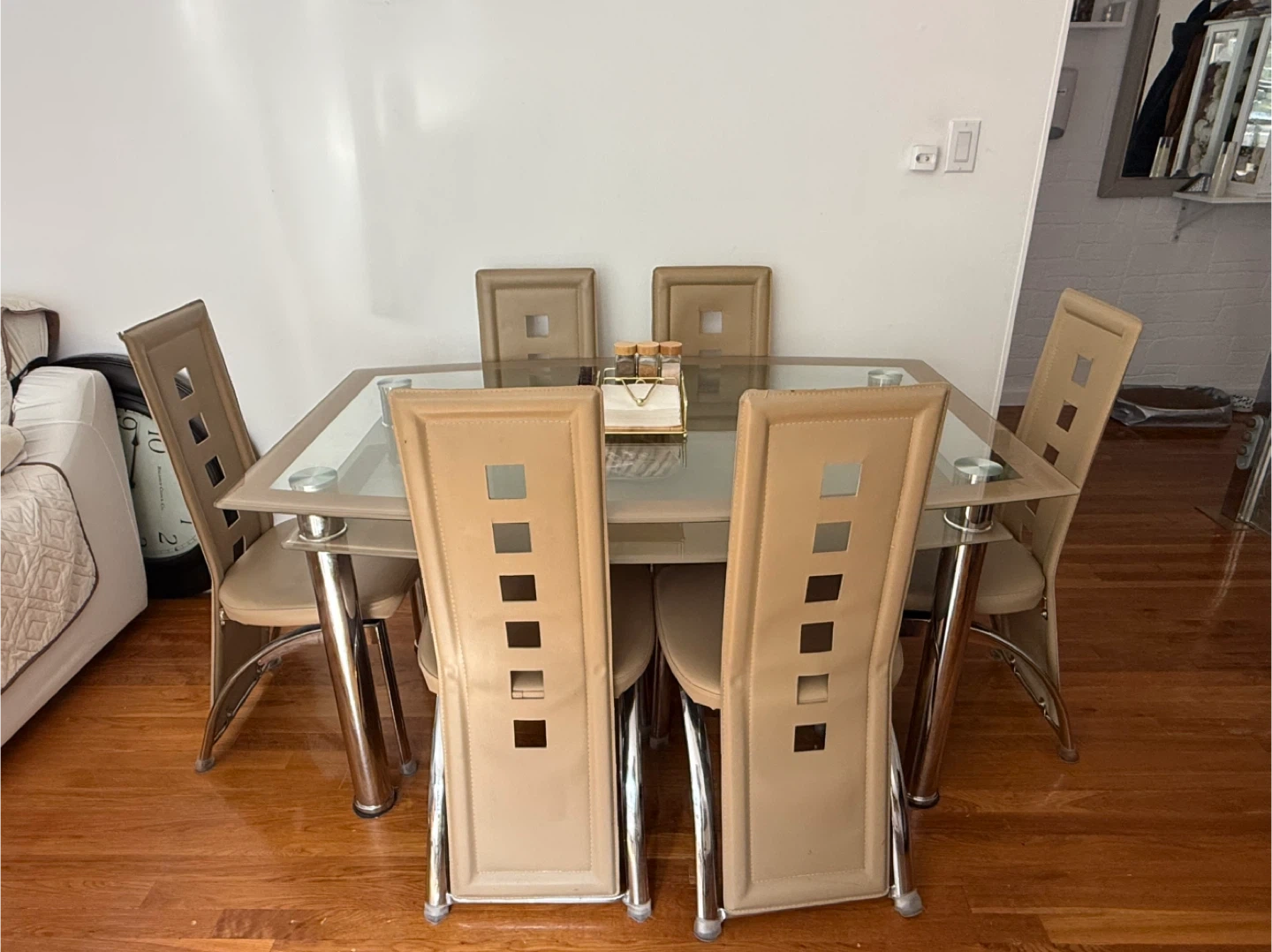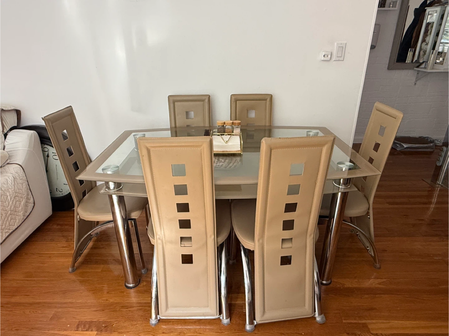 Selling a dining table with six chairs! The set features a glass top table and beige chairs with a unique cut-out design on the backrests. The table legs and chair frames are made of metal, giving it a modern look. It's perfect for a dining room or kitchen area!