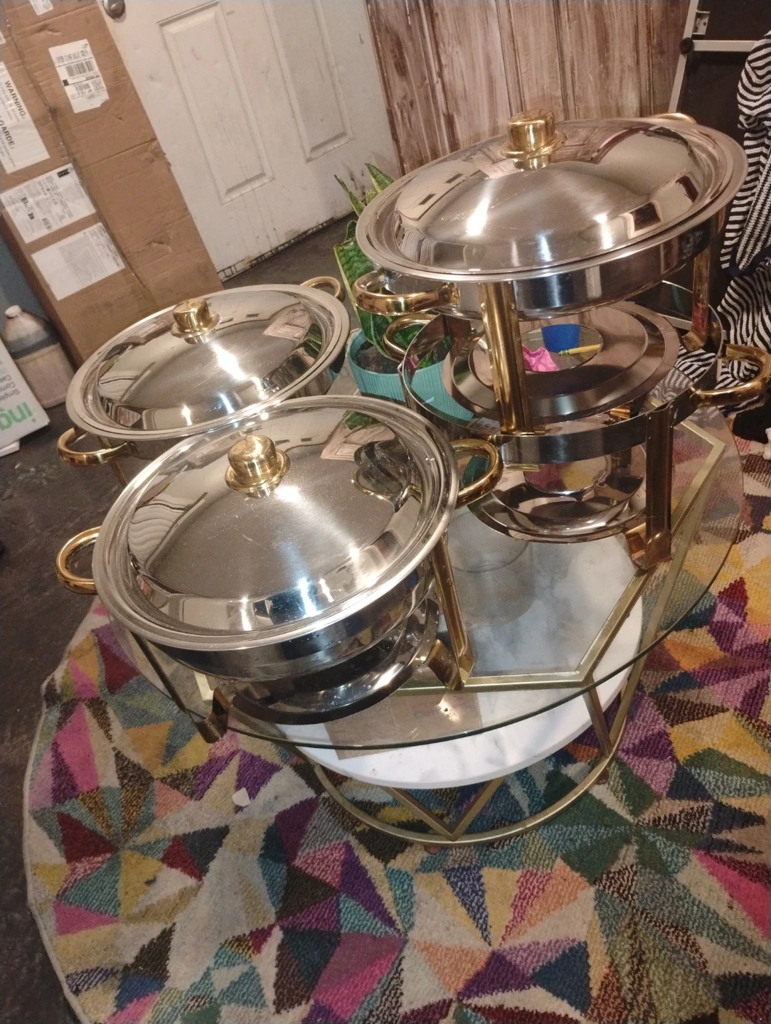 Selling a set of stainless steel chafing dishes! They're perfect for keeping food warm at parties or gatherings. The set includes multiple dishes and a stand. They have a shiny, clean look and are ready to use for your next event!