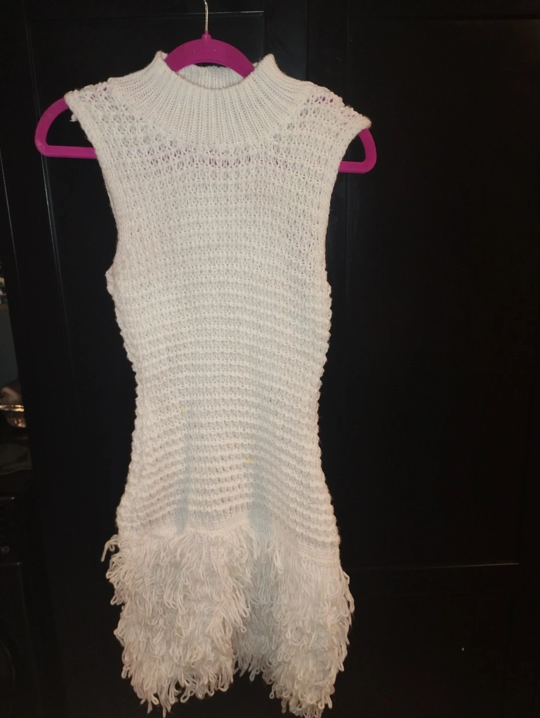 Selling a white knit sleeveless top. It has a unique fringe detail at the bottom. It's in good condition and ready for a new home!