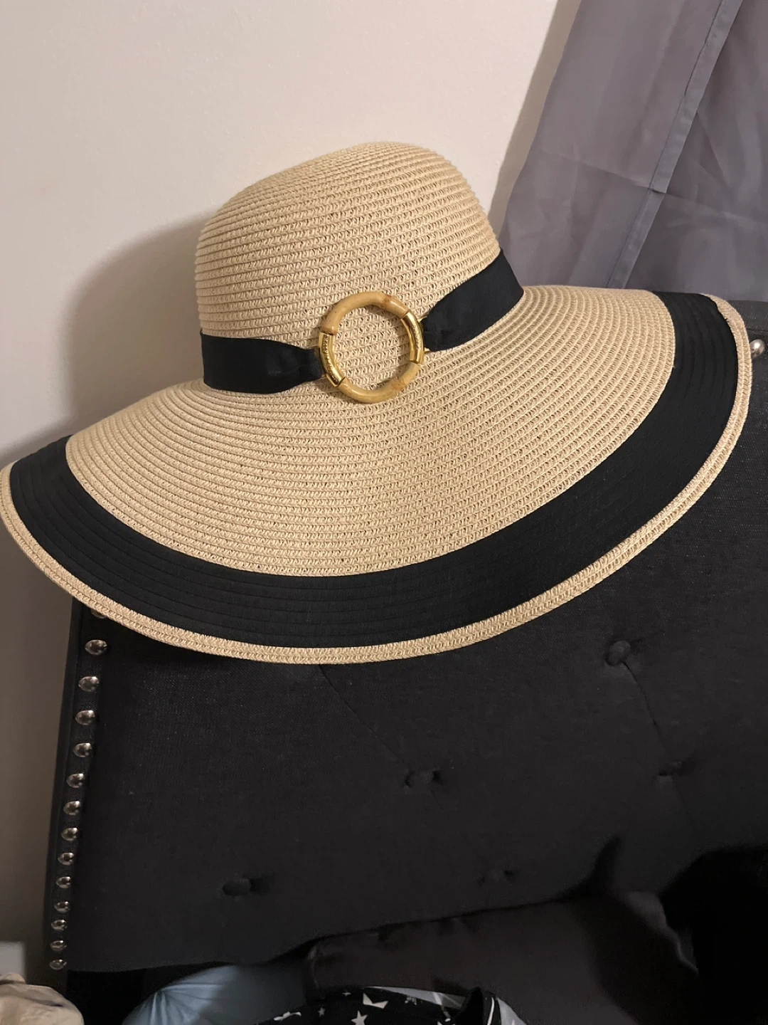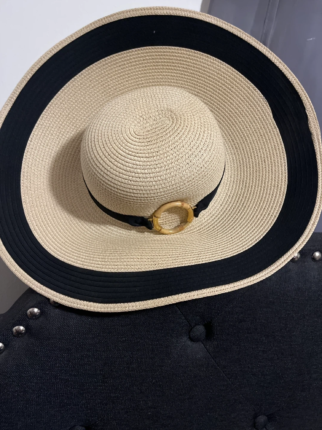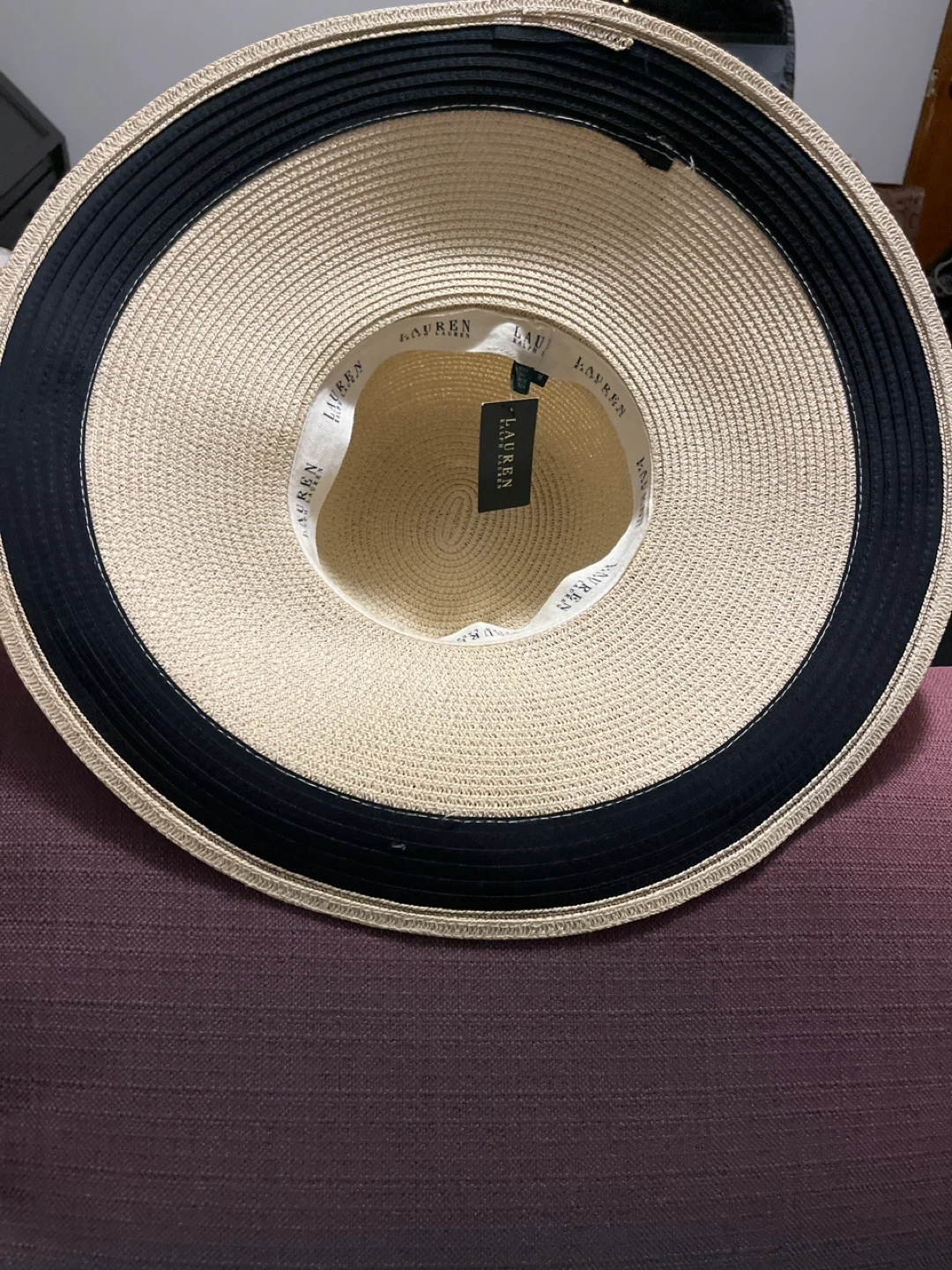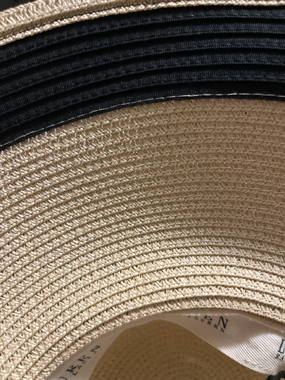Stylish Ralph Lauren straw hat in size M! It features a chic black ribbon and a unique bamboo-style ring detail. The hat is in great condition and ready to accessorize your summer outfits. Style 4LS574, Color 001. Originally priced at $52
