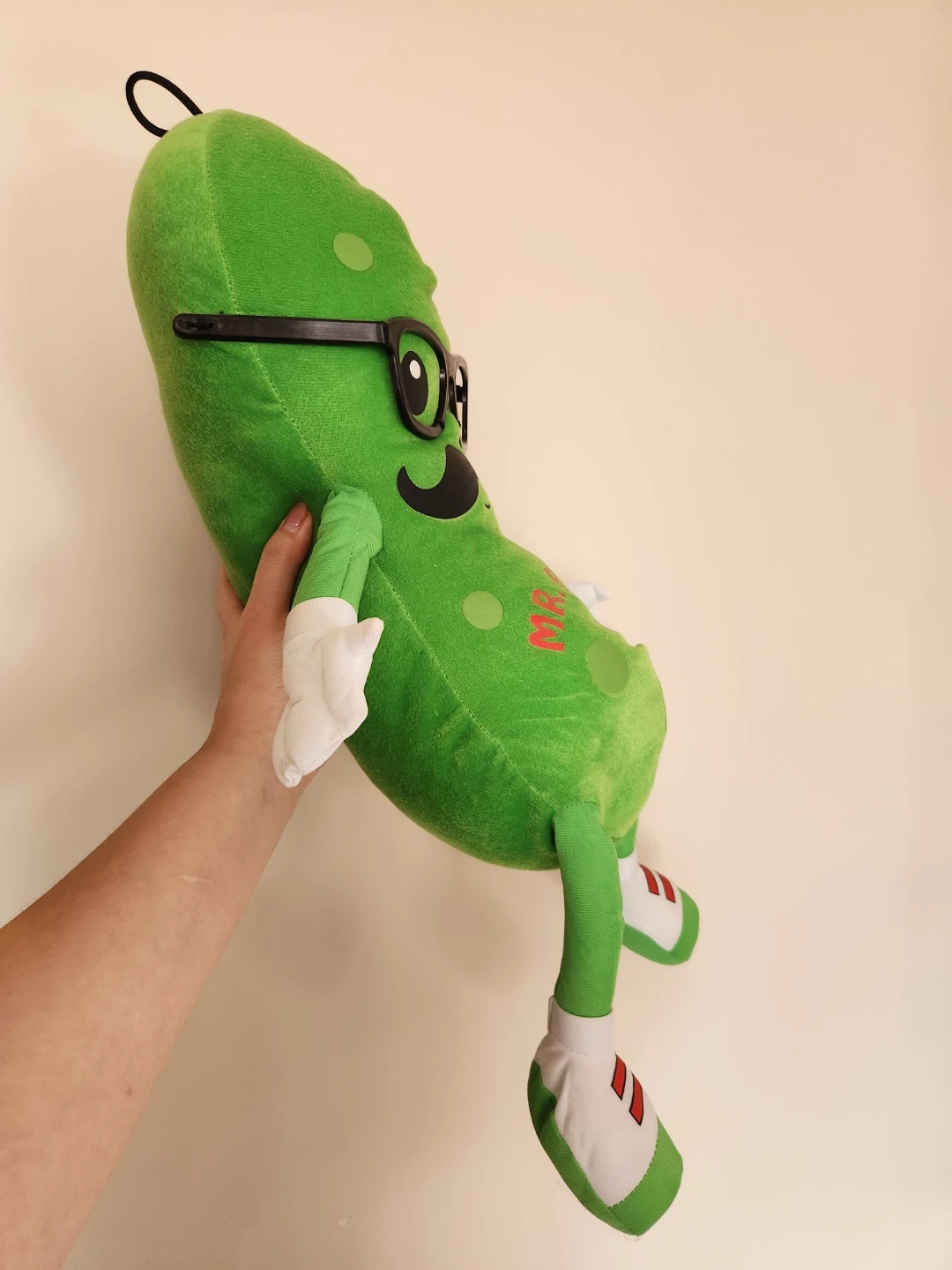 Mr. Pickle large stuffed toy in great condition and ready for a new home. Green pickle wears glasses, mustache, gloves, and little shoes.