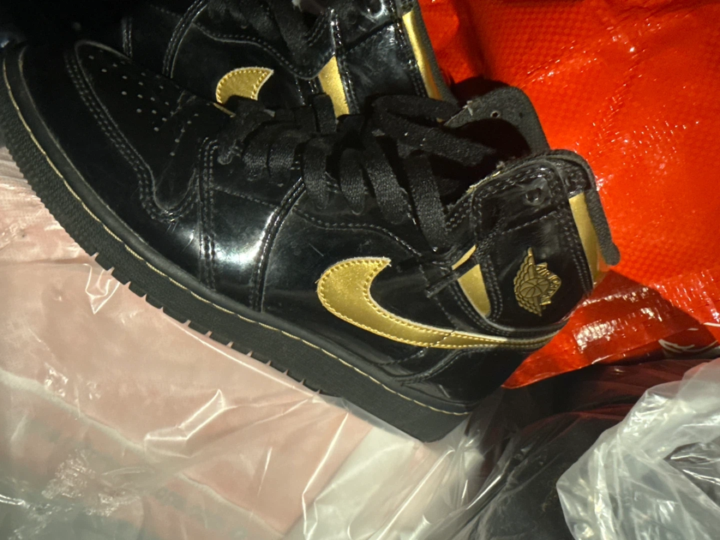 Selling a pair of Nike Air Jordan 1 Retro High sneakers in black and gold. They show some signs of wear, but are still in good condition. The iconic Nike swoosh is prominently displayed in gold, adding a touch of style to the classic design