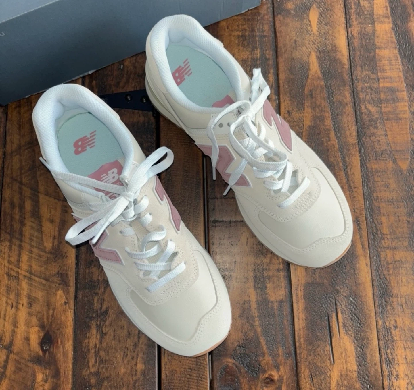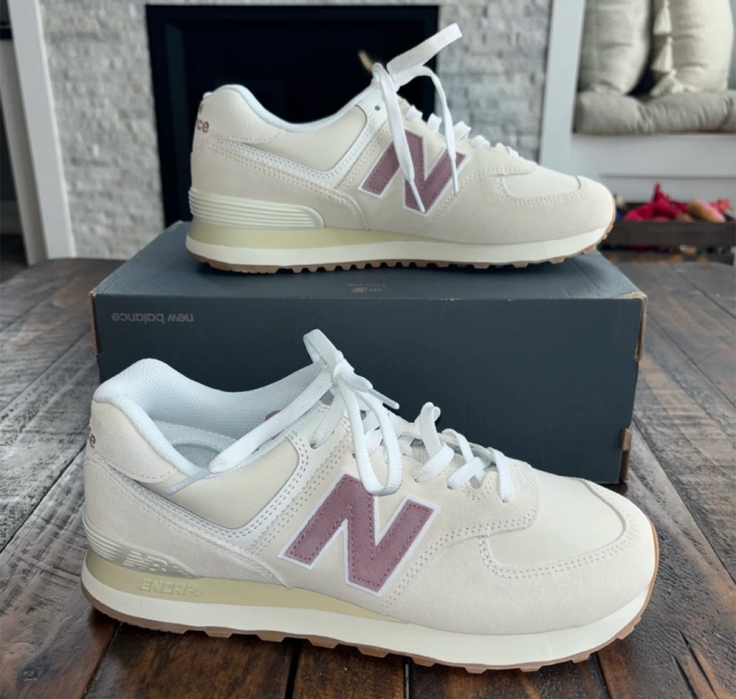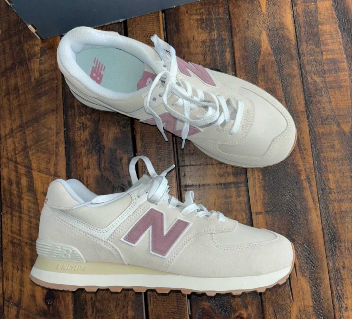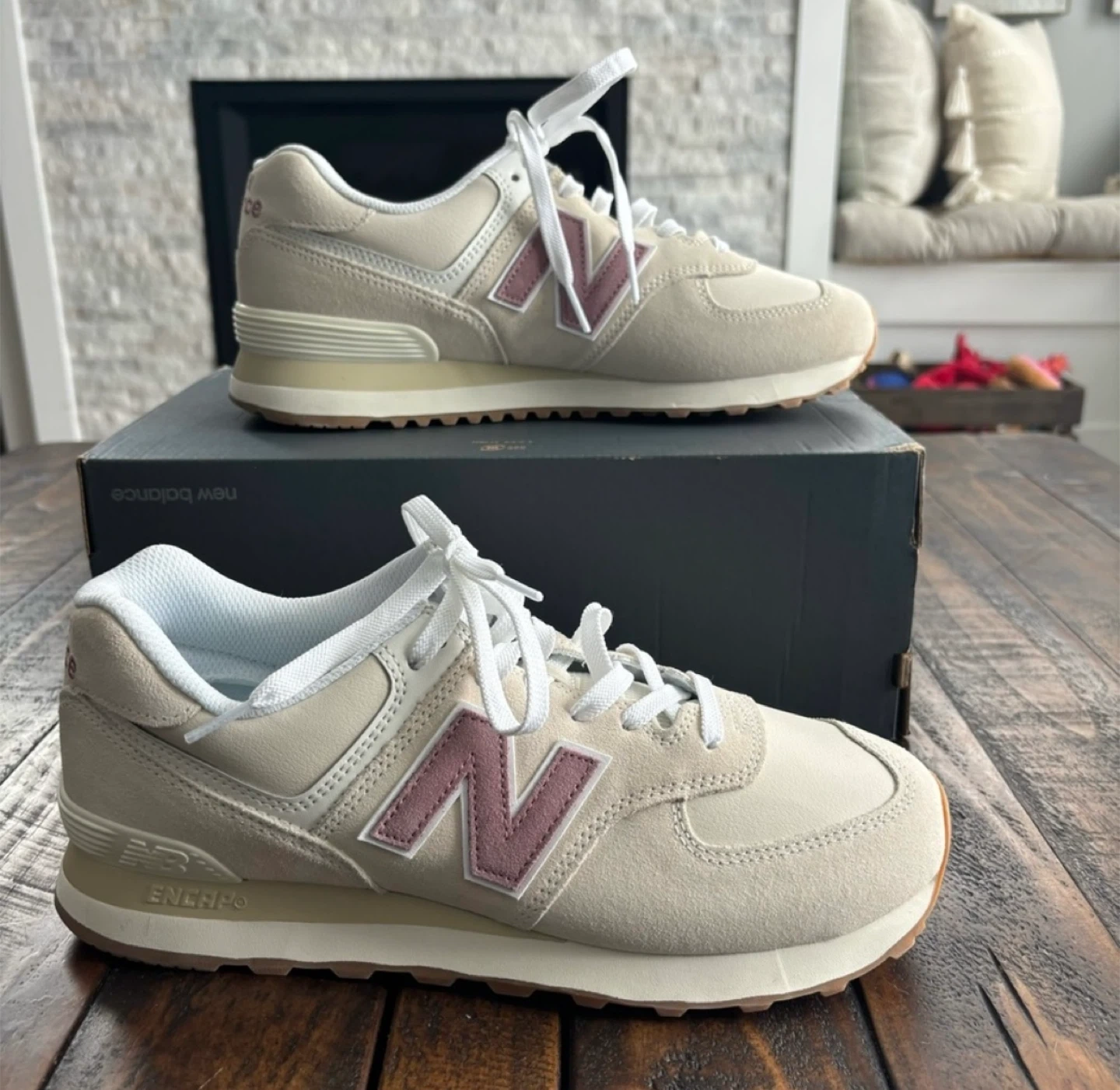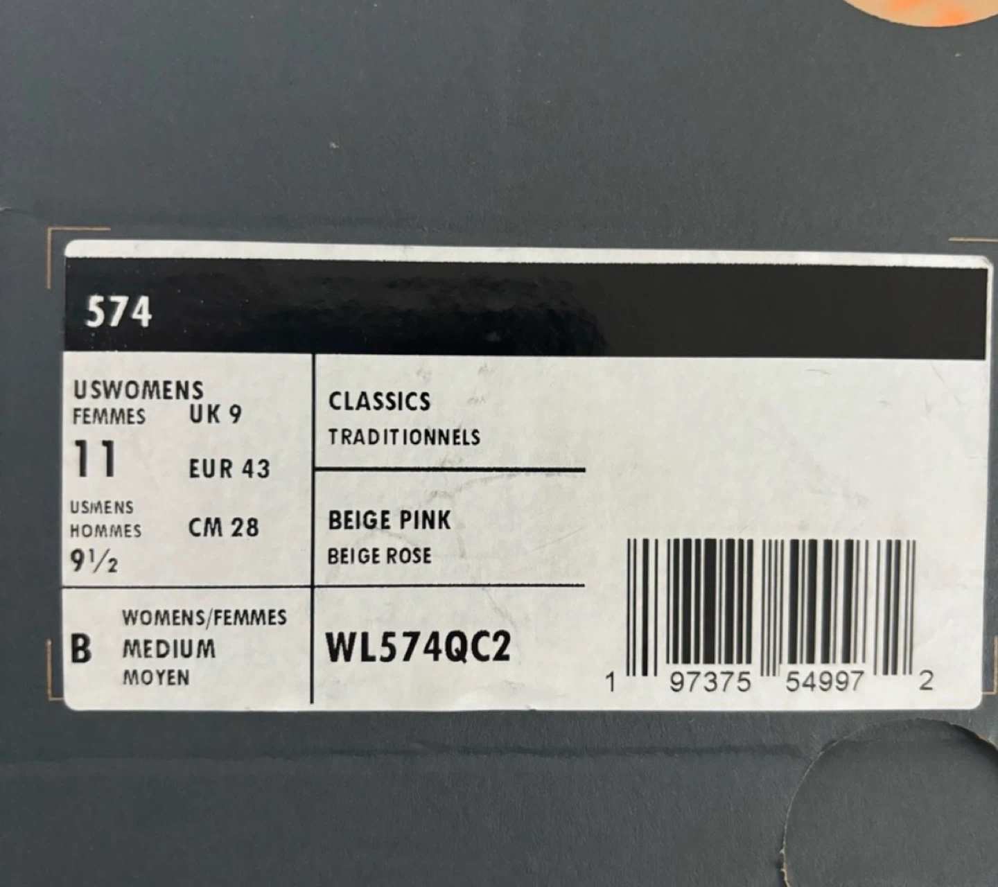 Selling a pair of New Balance 574 Classics in beige pink, women's size 11 US. These are in great condition and come with the original box! The shoes are a medium width.
