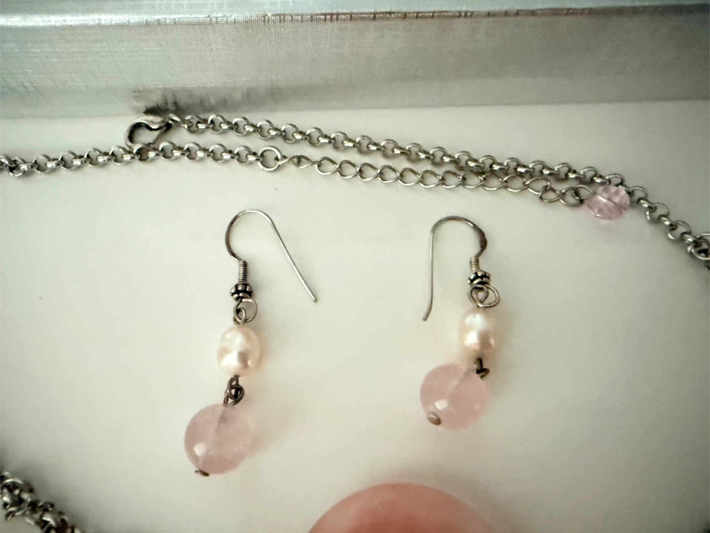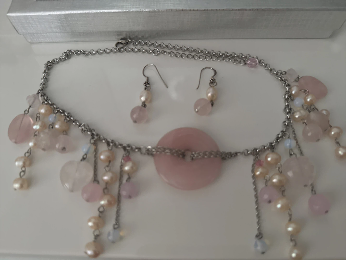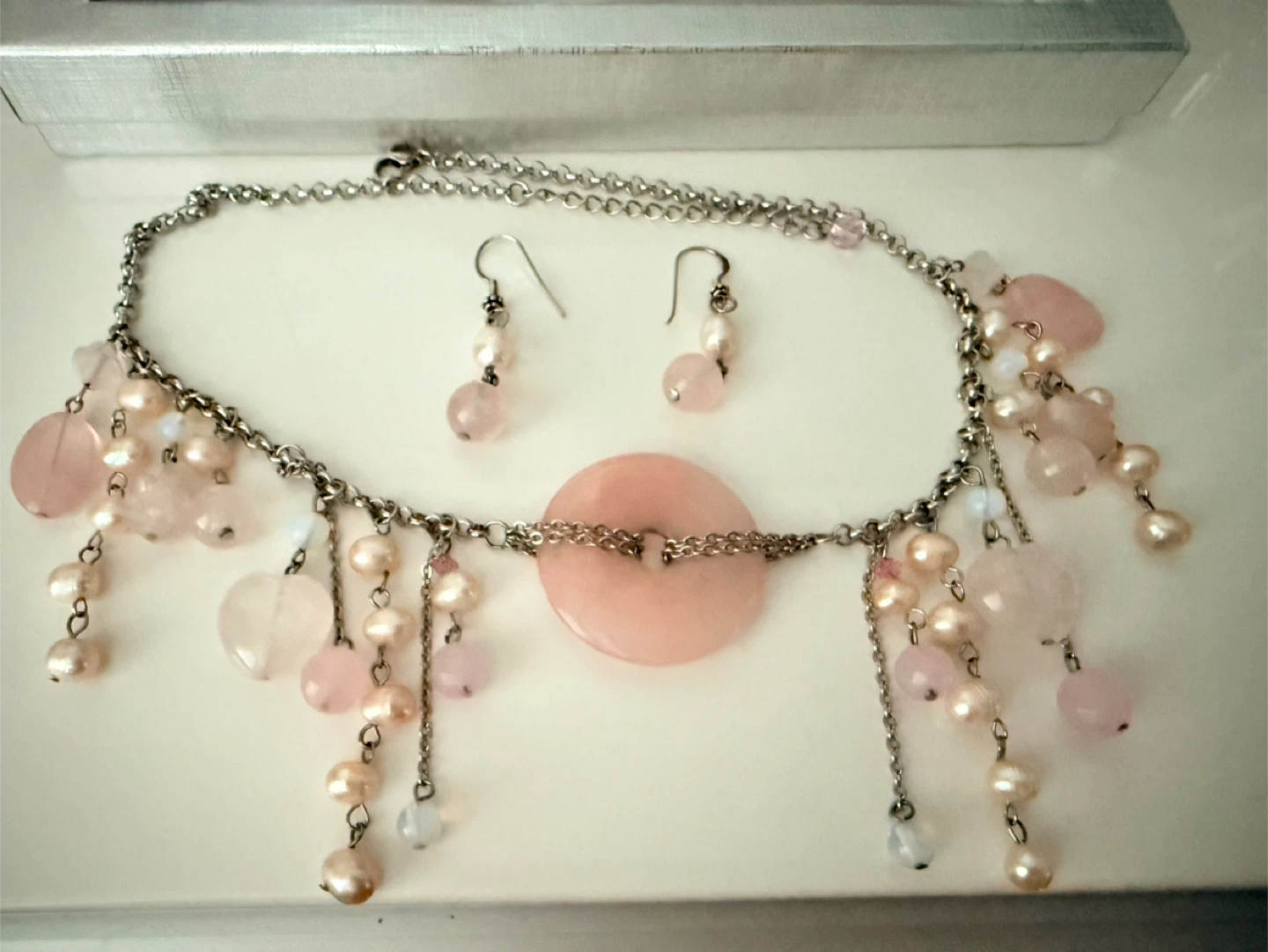Natural genuine rose quartz & pearls necklace earring set