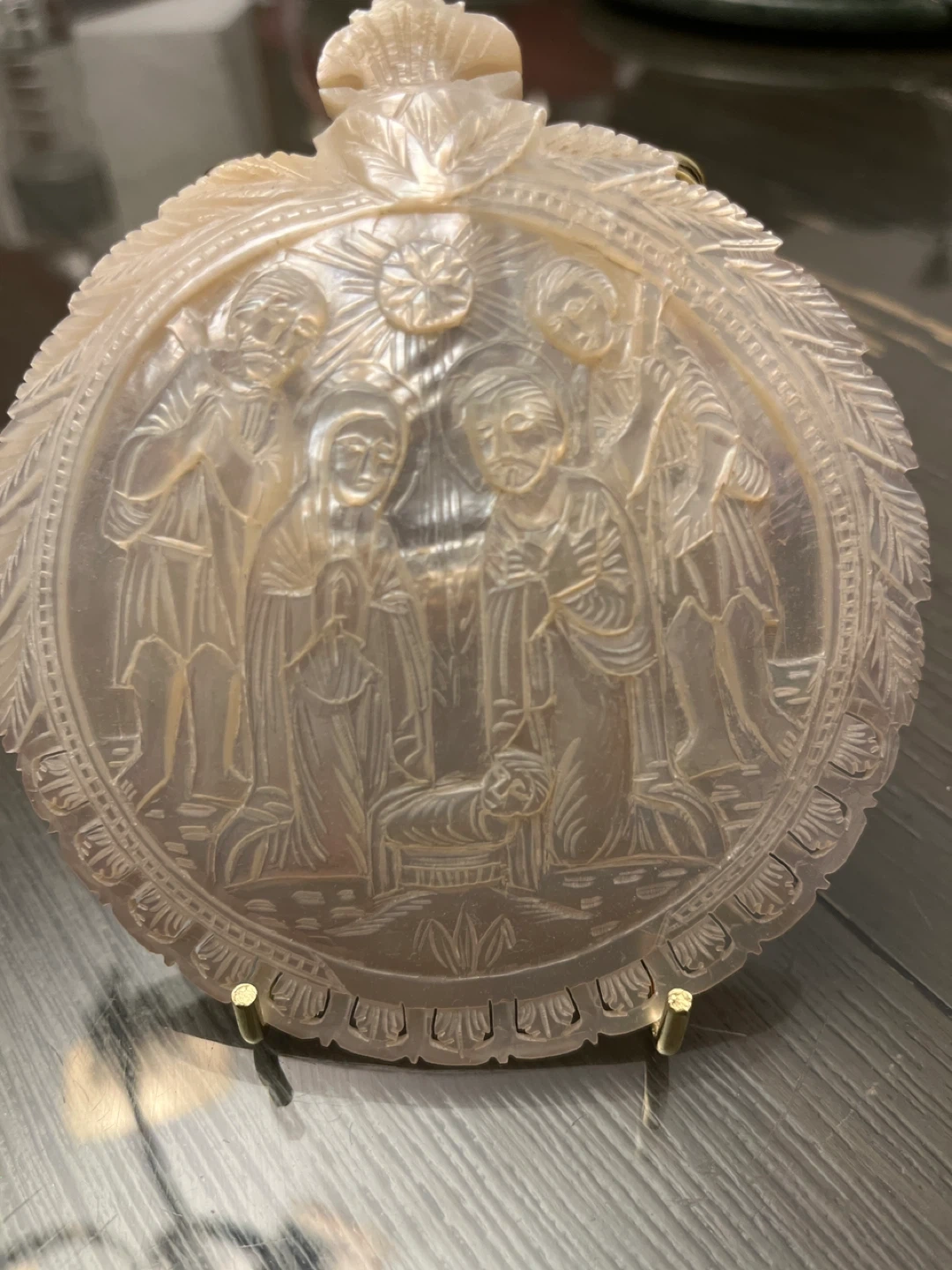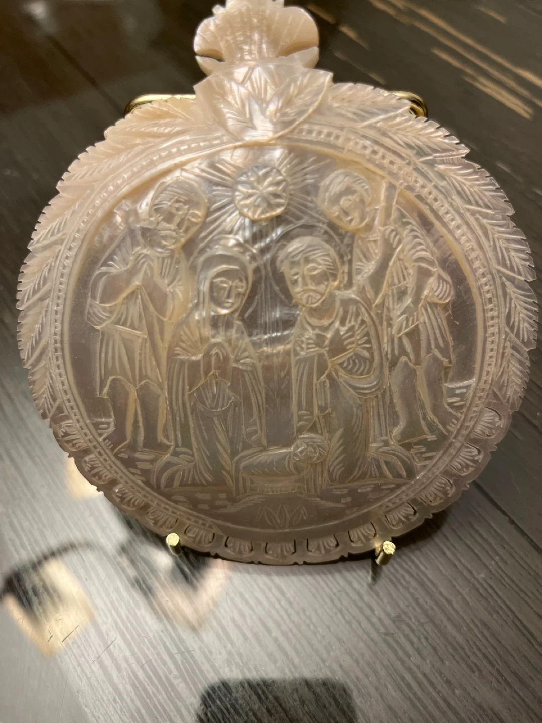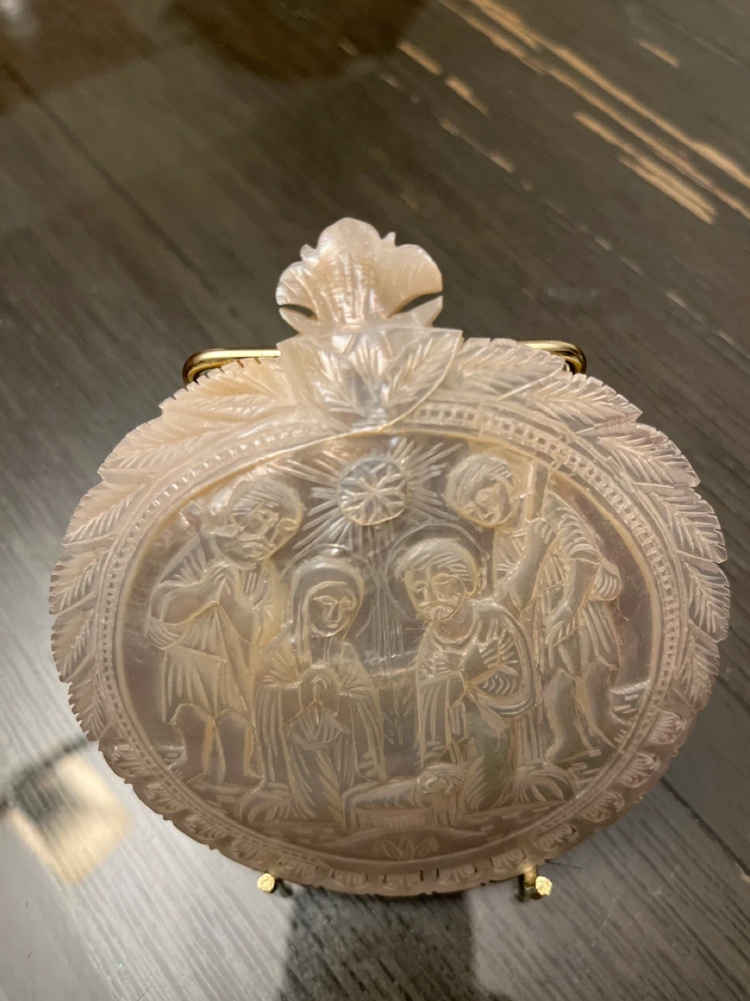 This is a beautiful vintage mother of pearl ornament featuring a nativity scene. It comes with a gold-colored metal display stand. The ornament has intricate carvings and a lovely iridescent sheen. It would make a wonderful addition to any holiday decor or a thoughtful gift for someone who appreciates religious art