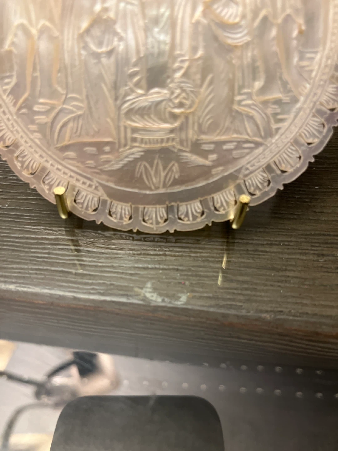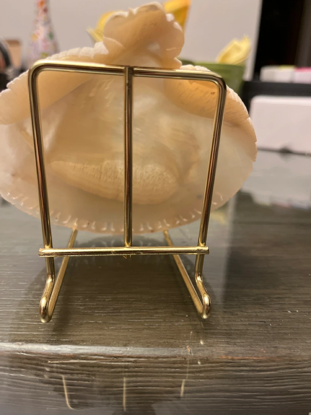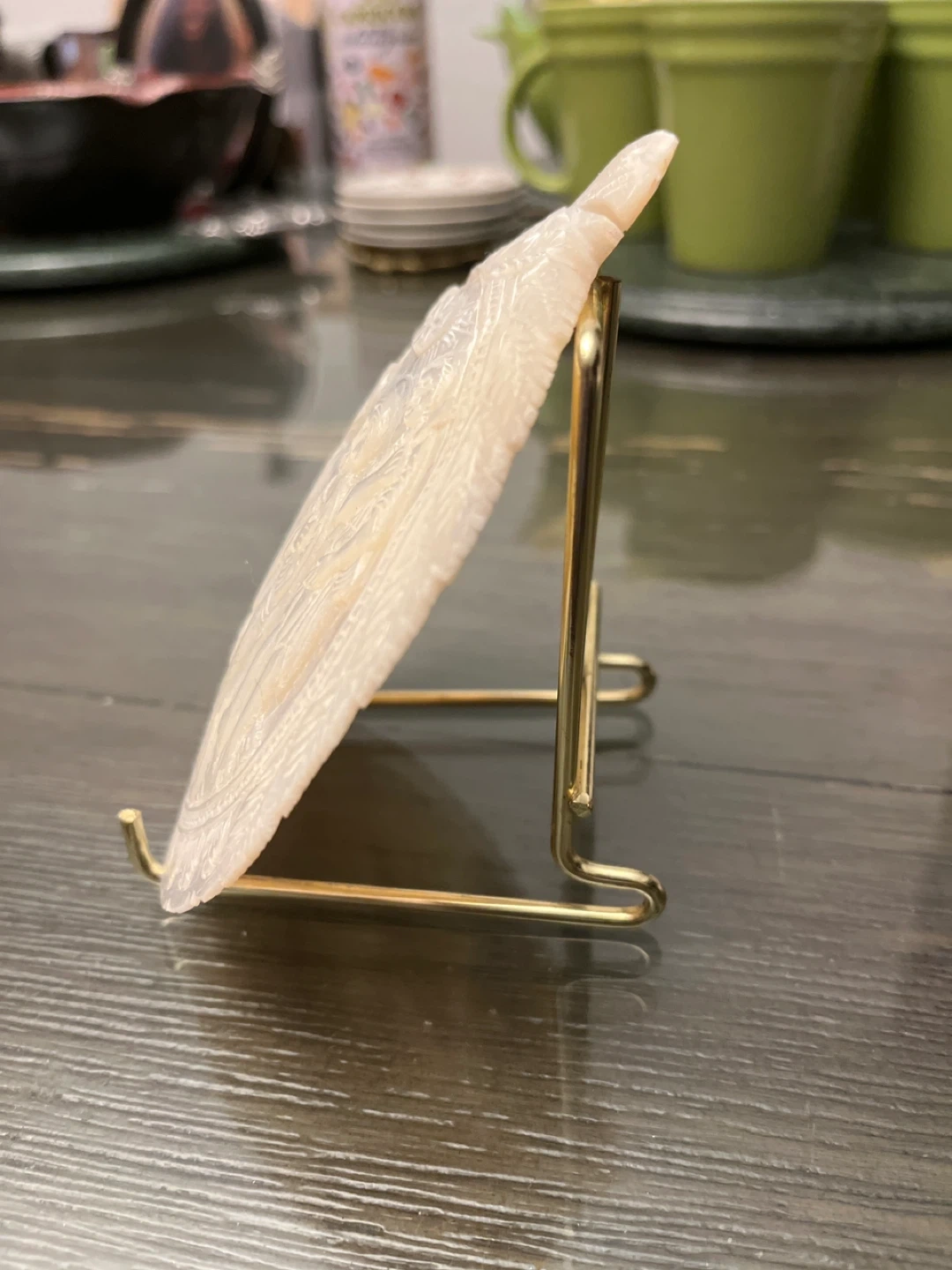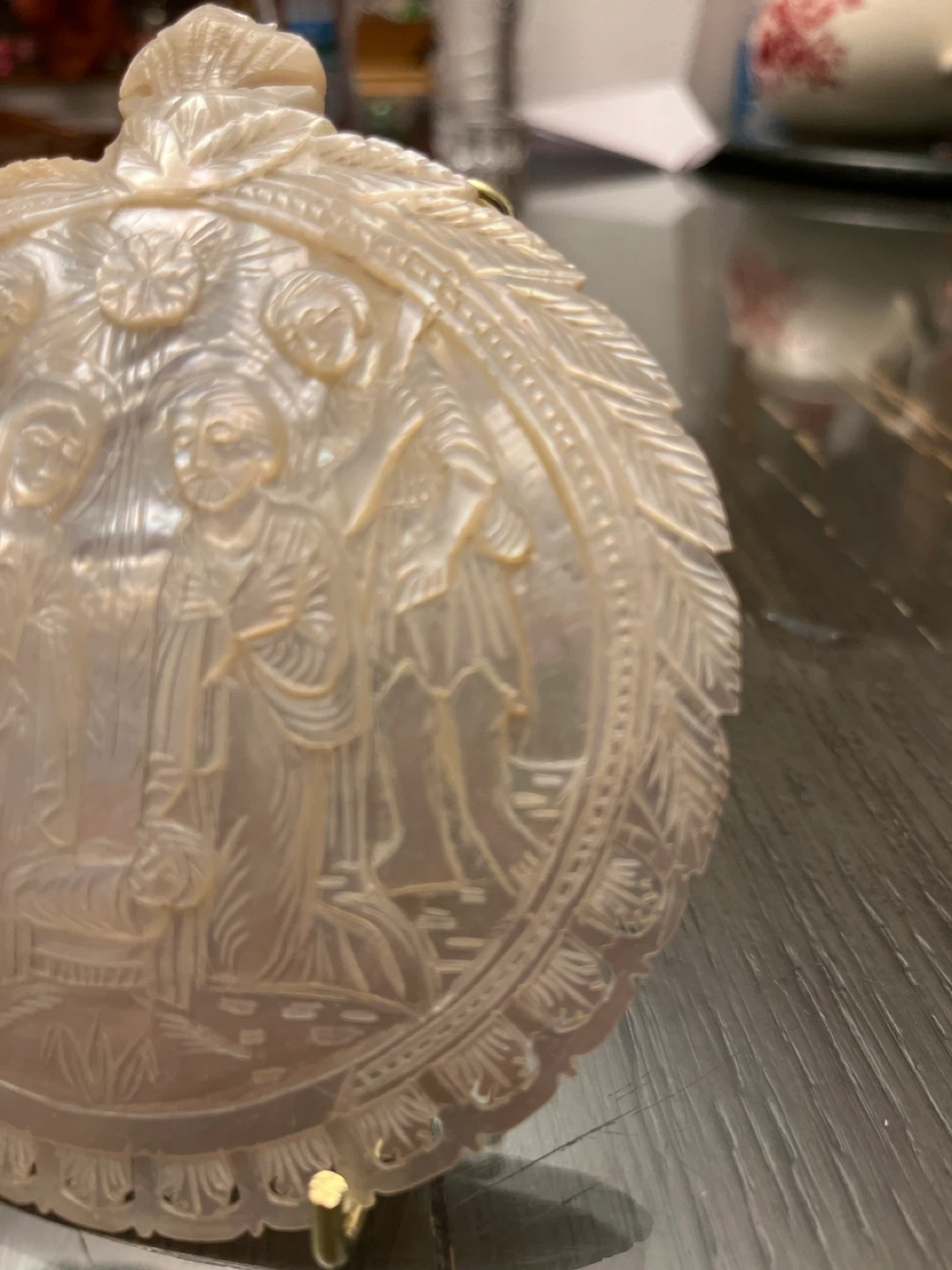 This is a beautiful vintage mother of pearl ornament featuring a nativity scene. It comes with a gold-colored metal display stand. The ornament has intricate carvings and a lovely iridescent sheen. It would make a wonderful addition to any holiday decor or a thoughtful gift for someone who appreciates religious art