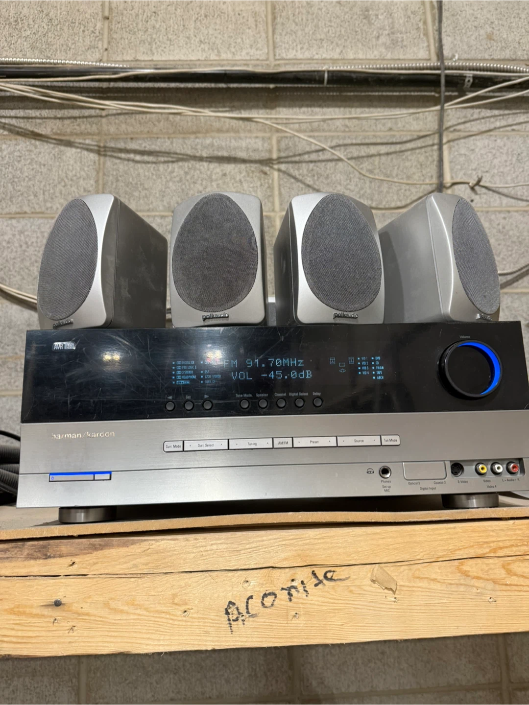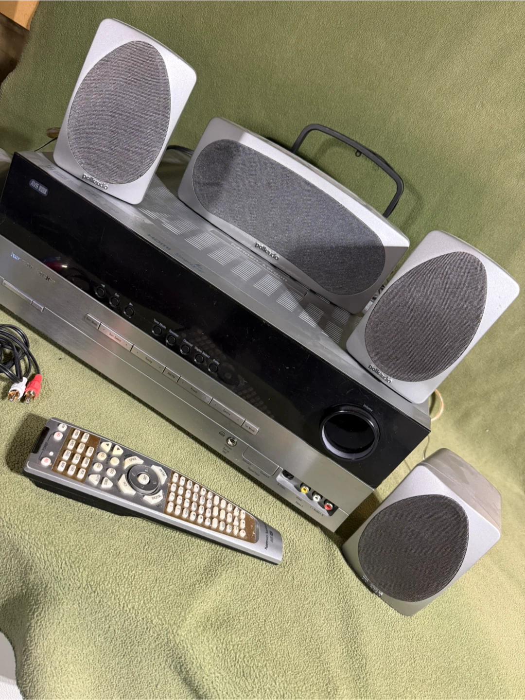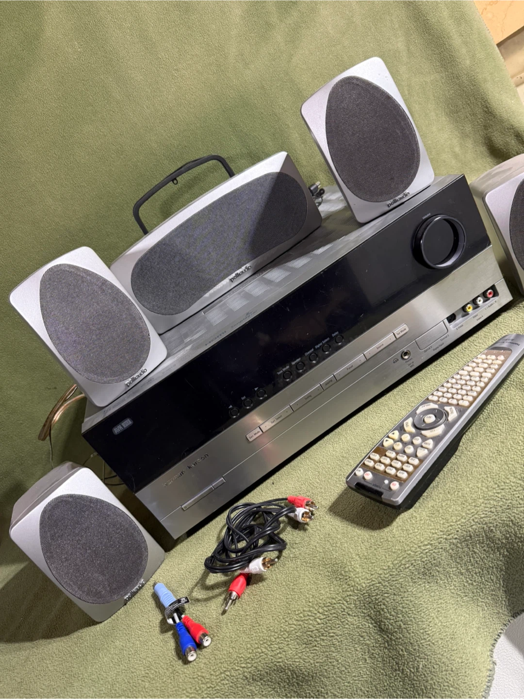 This used Harmon Kardon receiver comes with a set of five Polk Audio speakers, perfect for creating a surround sound system in your garage/shop. Etc.