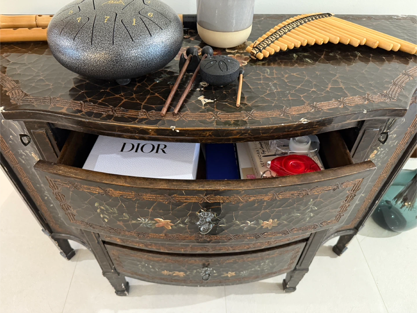 Selling a unique accent cabinet with a lovely floral design! It features three drawers and a cabinet space, perfect for adding a touch of elegance to any room. There are some signs of wear on the top, as pictured.