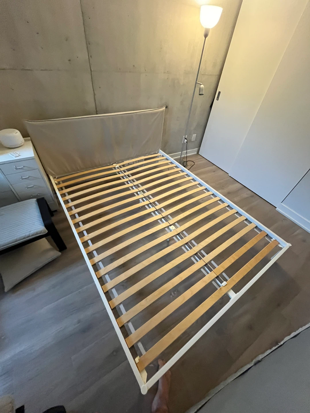 Selling an IKEA KLEPPSTAD bed frame in queen size! It's in great condition and ready for a new home. The frame is white and comes with the slatted bed base. It's super easy to assemble and provides great support for your mattress. Perfect for adding a minimalist touch to your bedroom. Like new.
