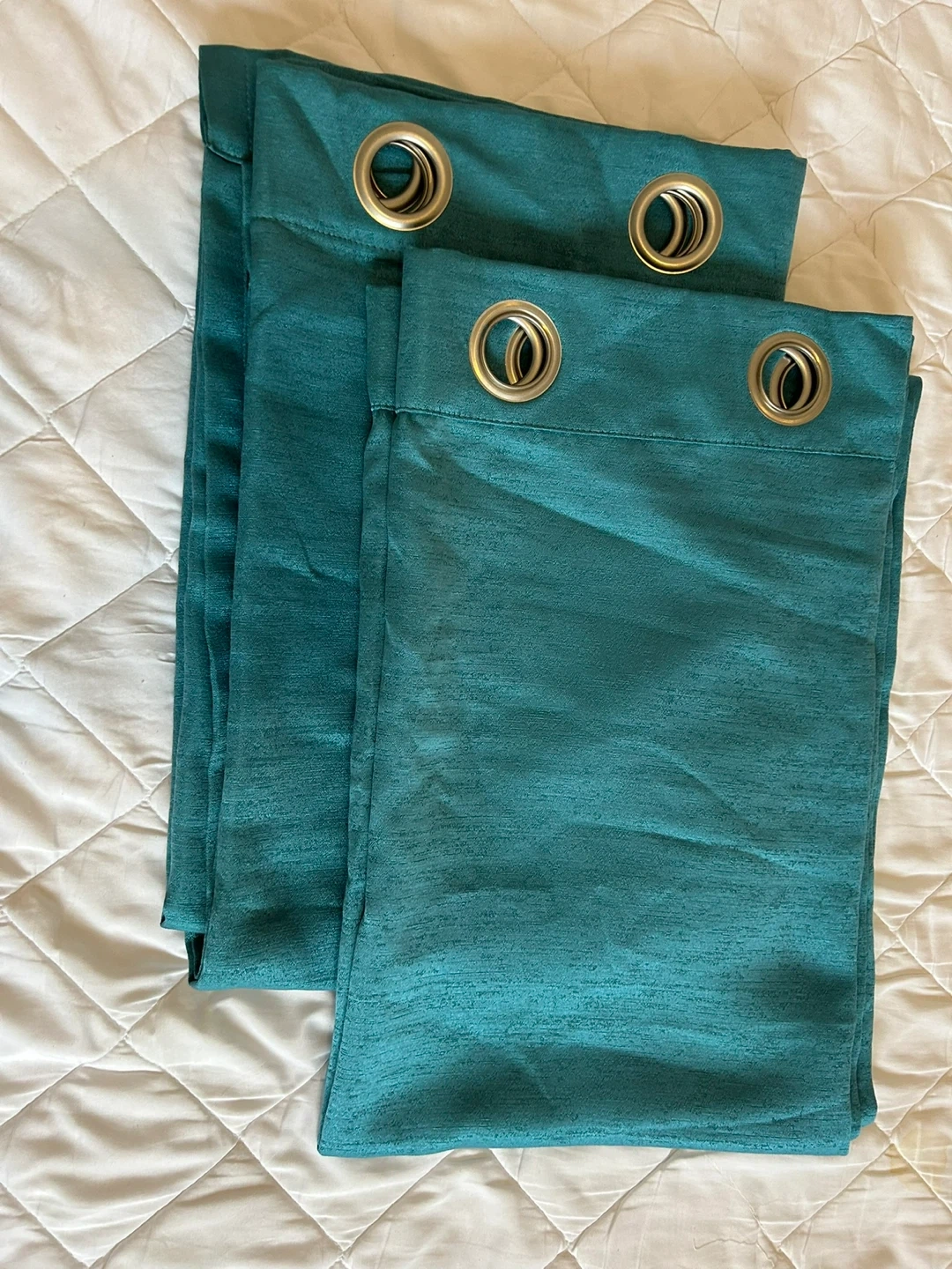 I'm selling a set of two teal blue curtains. They have a nice texture and are in great condition. Perfect for adding a pop of colour to any room!