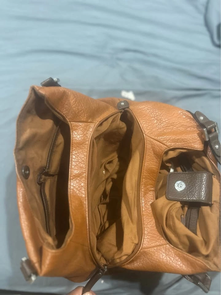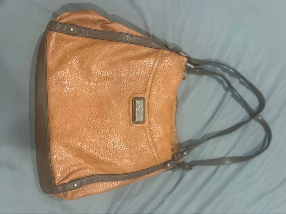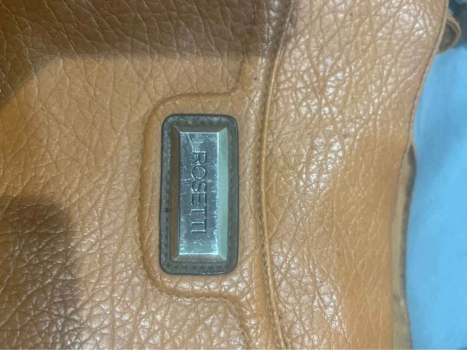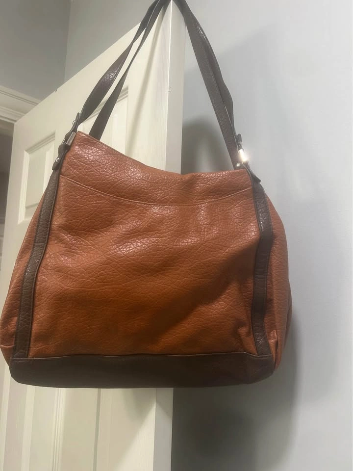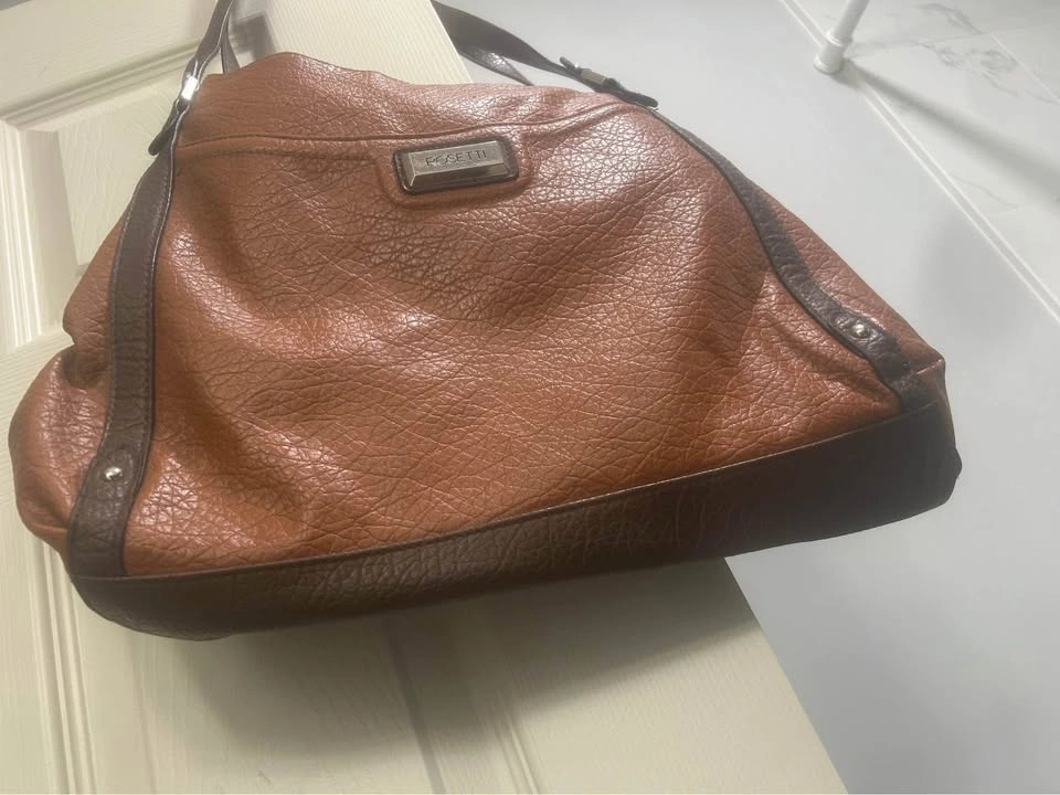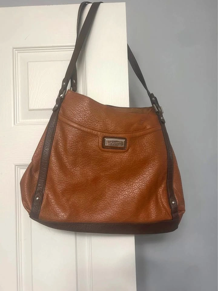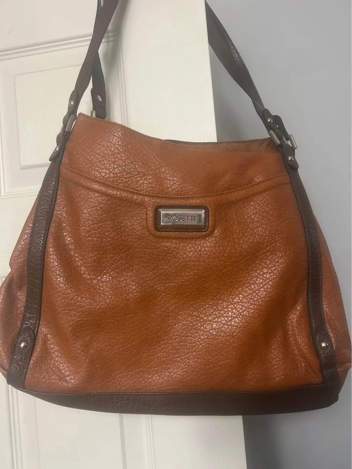 Beautiful Rosetti leather handbag in a rich brown tone with darker brown trim. Made from durable, textured faux leather with a roomy interior — perfect for everyday use or dressing up an outfit.