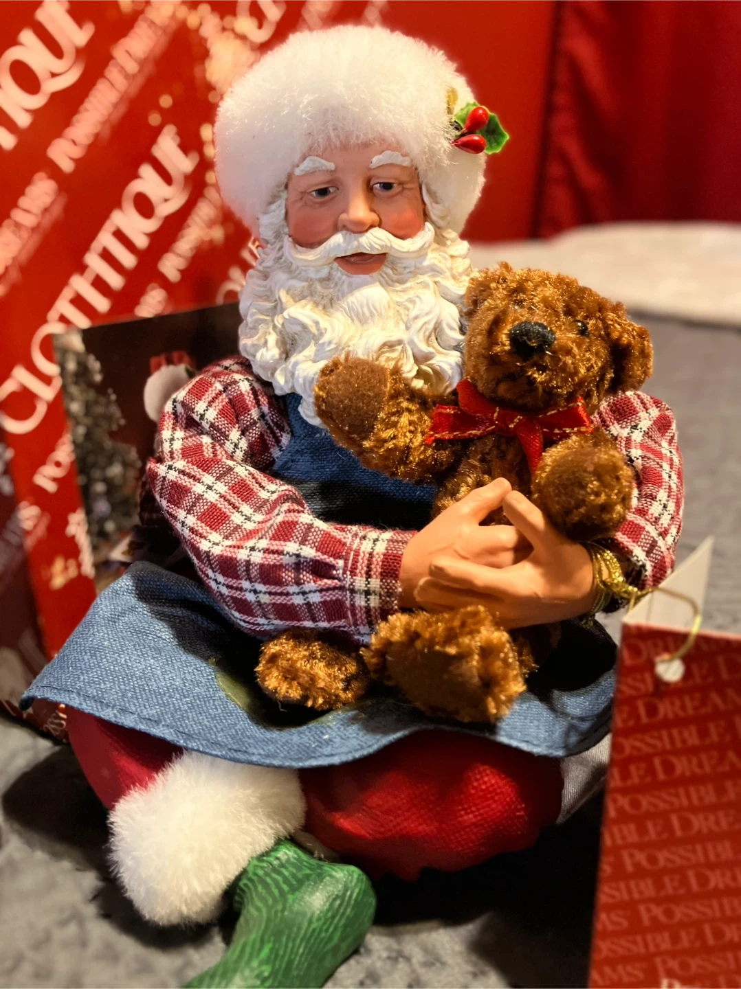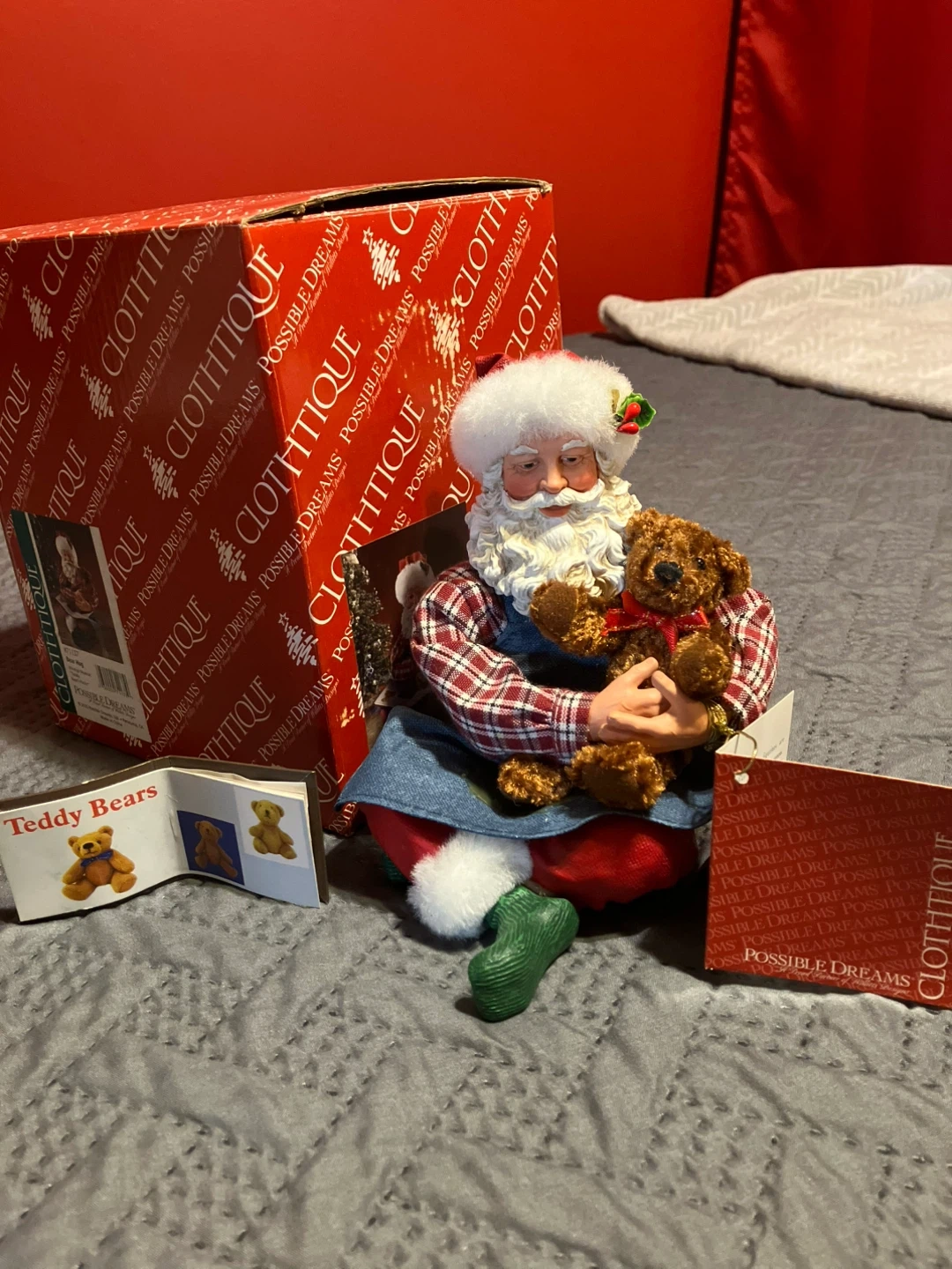 This is a Possible Dreams Clothtique Santa figurine music box. It comes with its original box and a little teddy bear accessory. This charming piece would be a great addition to any holiday collection!