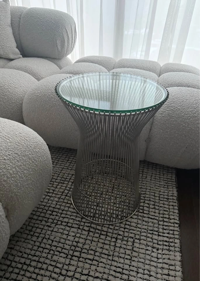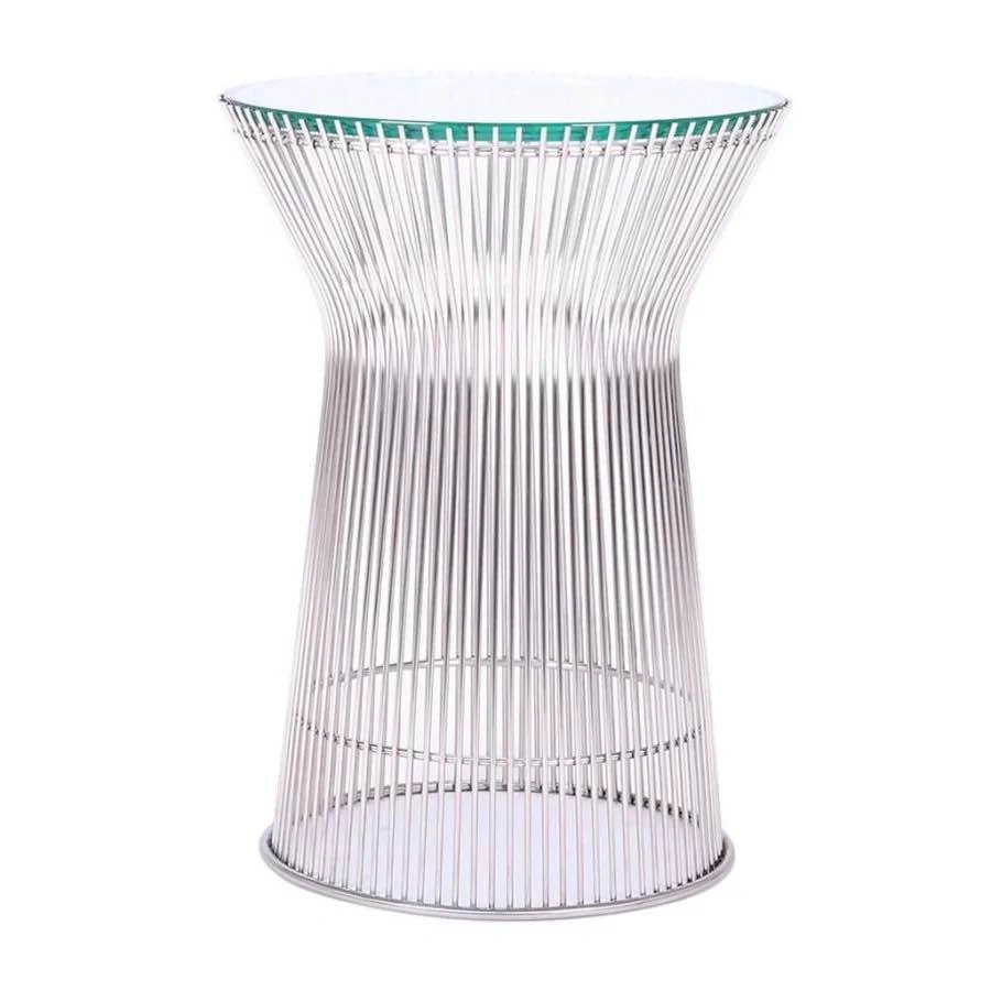 Sculptural Platner, eternity modern-contemporary inspired side table with a sleek glass top (14.5” diameter) and architectural steel wire base.