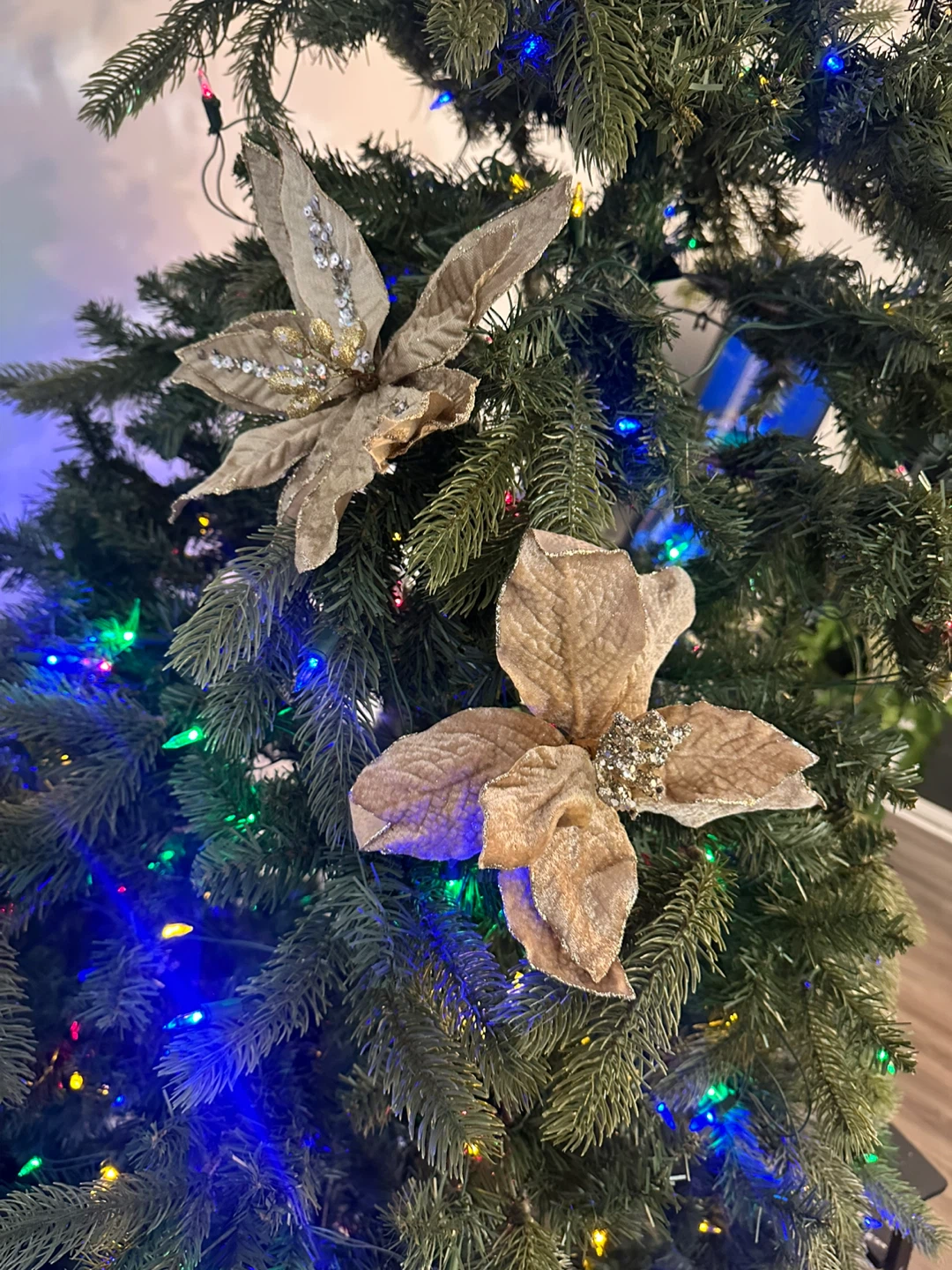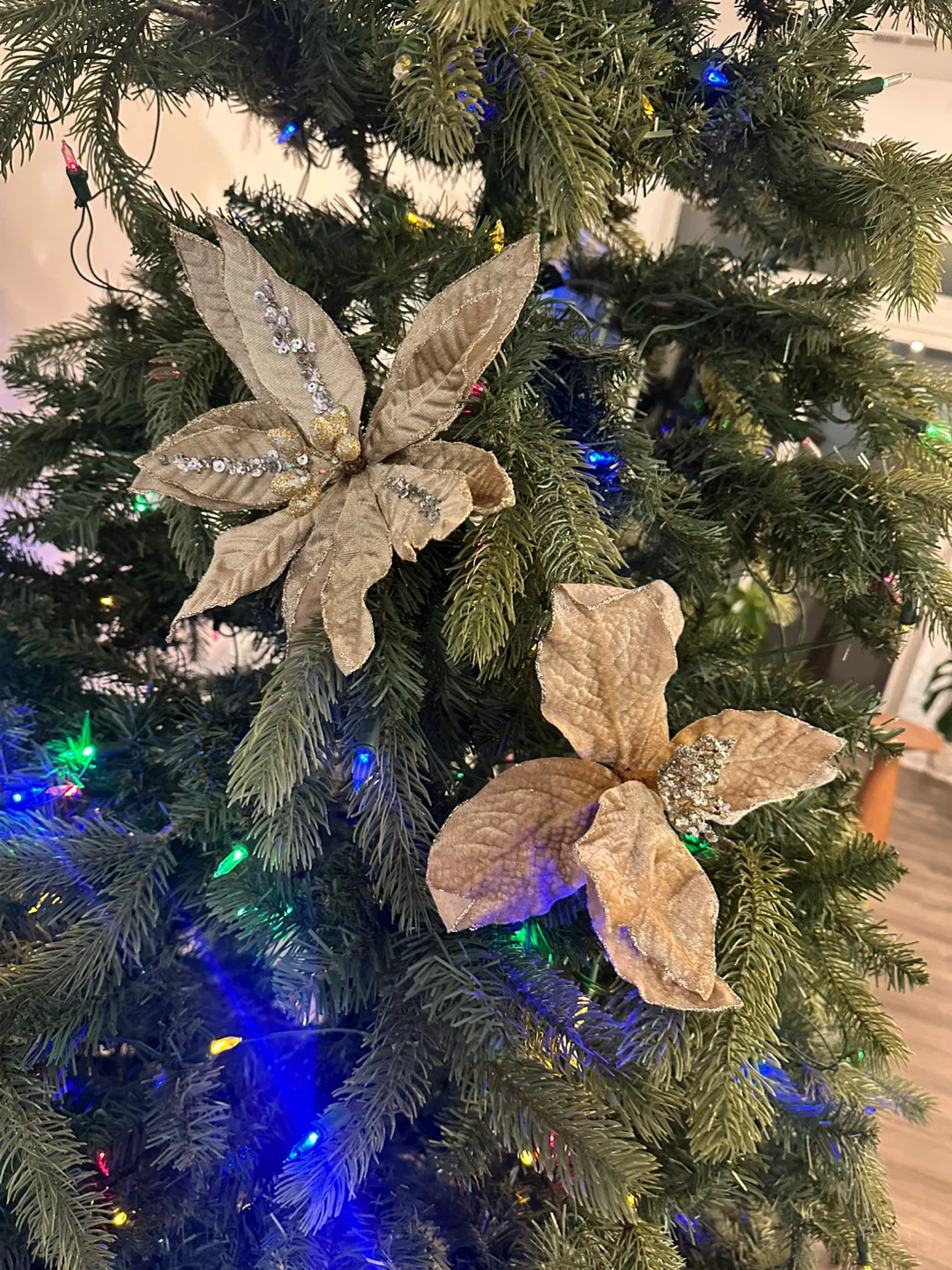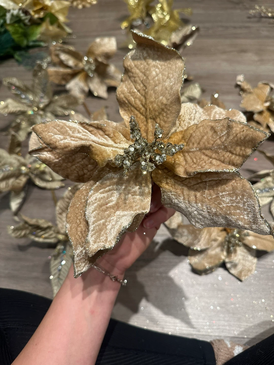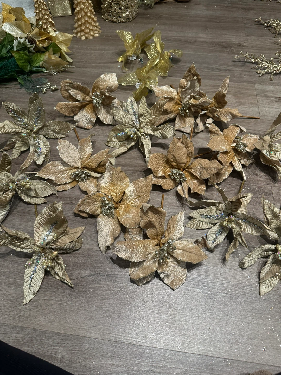 These are gold Christmas poinsettia flower ornaments. They are a great addition to any tree or holiday decor. They have a velvet texture and are embellished with glitter and rhinestones