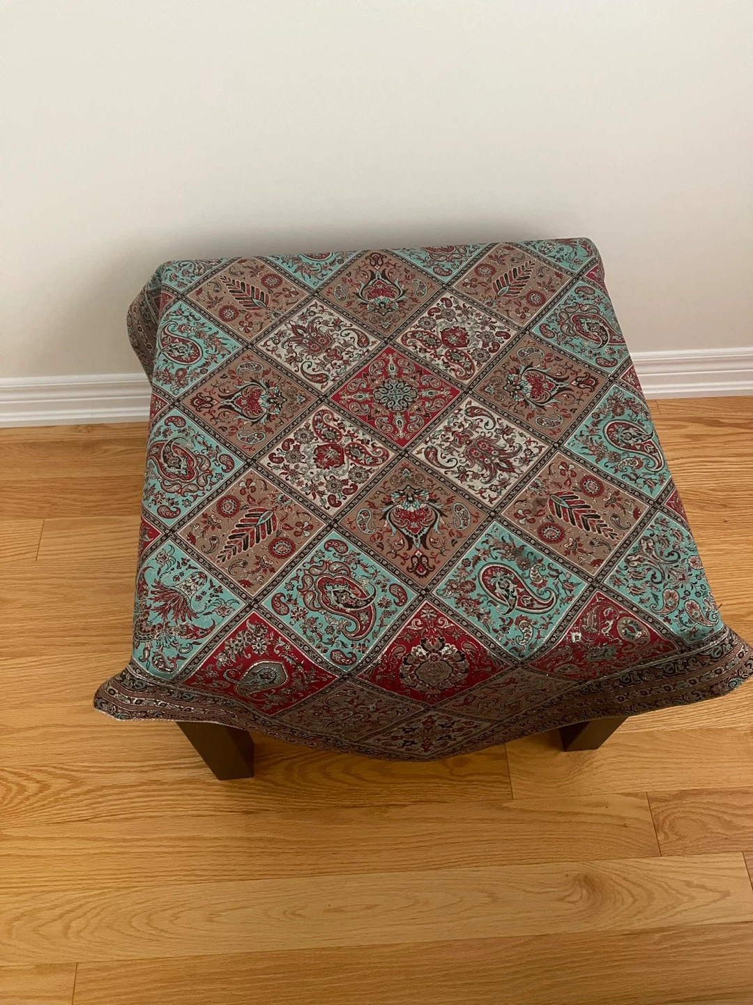 Selling a cute ottoman or footstool! It has a unique patterned fabric covering it, with a mix of teal, red, and brown colours. The legs are a dark wood colour. It's in great condition and would add a nice touch to any room!