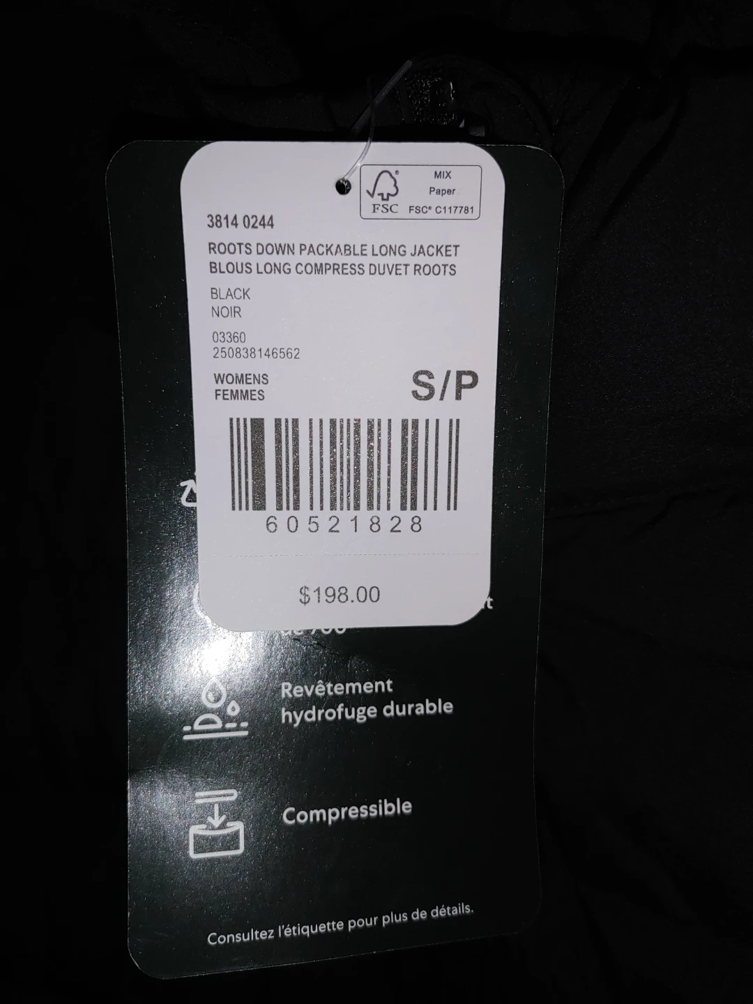 Selling a Roots Down Packable Long Jacket in black! It's a women's size S/P. Originally bought for $198. It's packable and has a durable water repellent coating