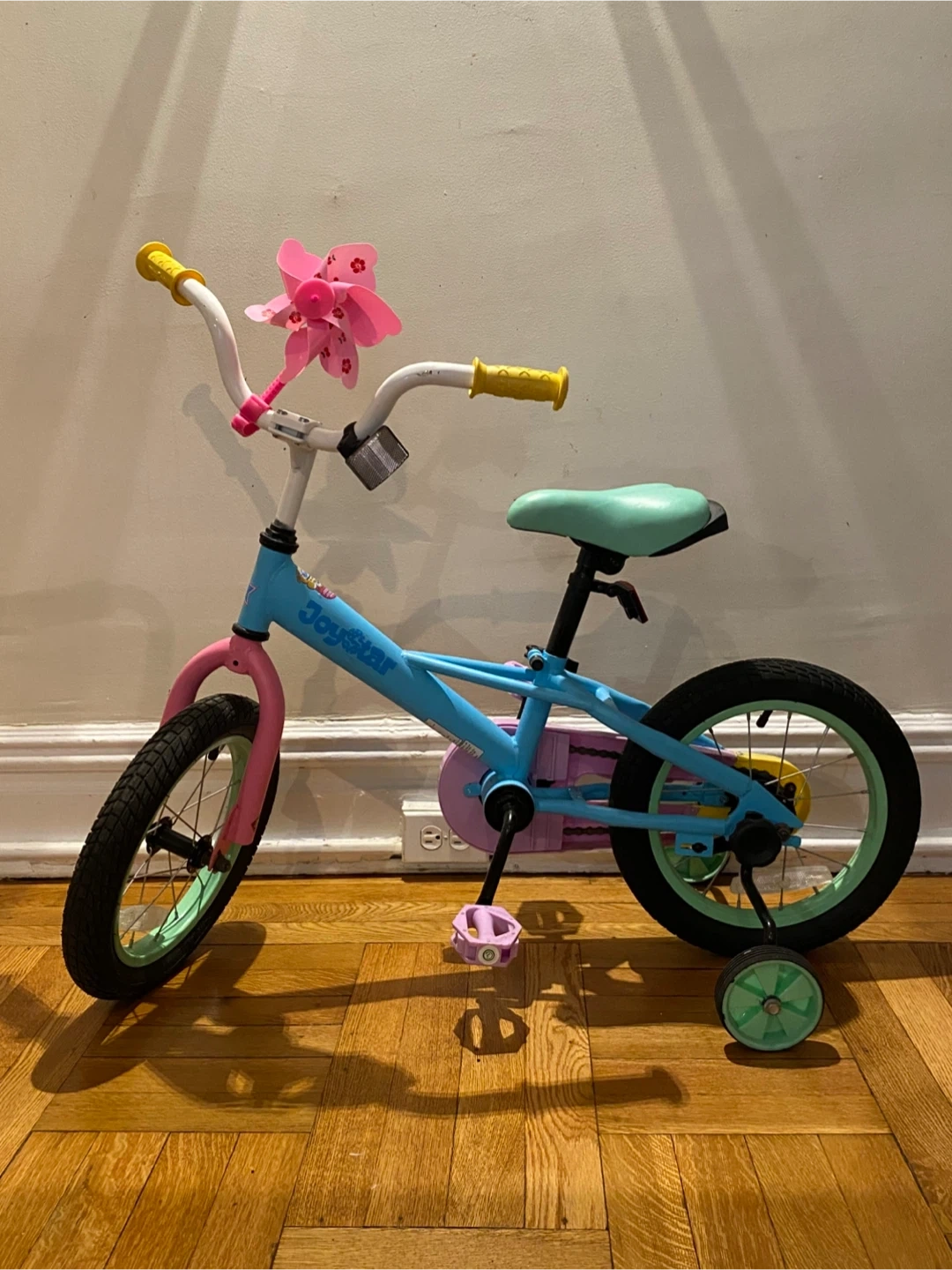 Selling a cute JoyStar kids bike! It's in great new condition and perfect for a little one learning to ride. Features a fun pink flower accessory on the handlebars and training wheels for extra stability. I also have a new helmet .