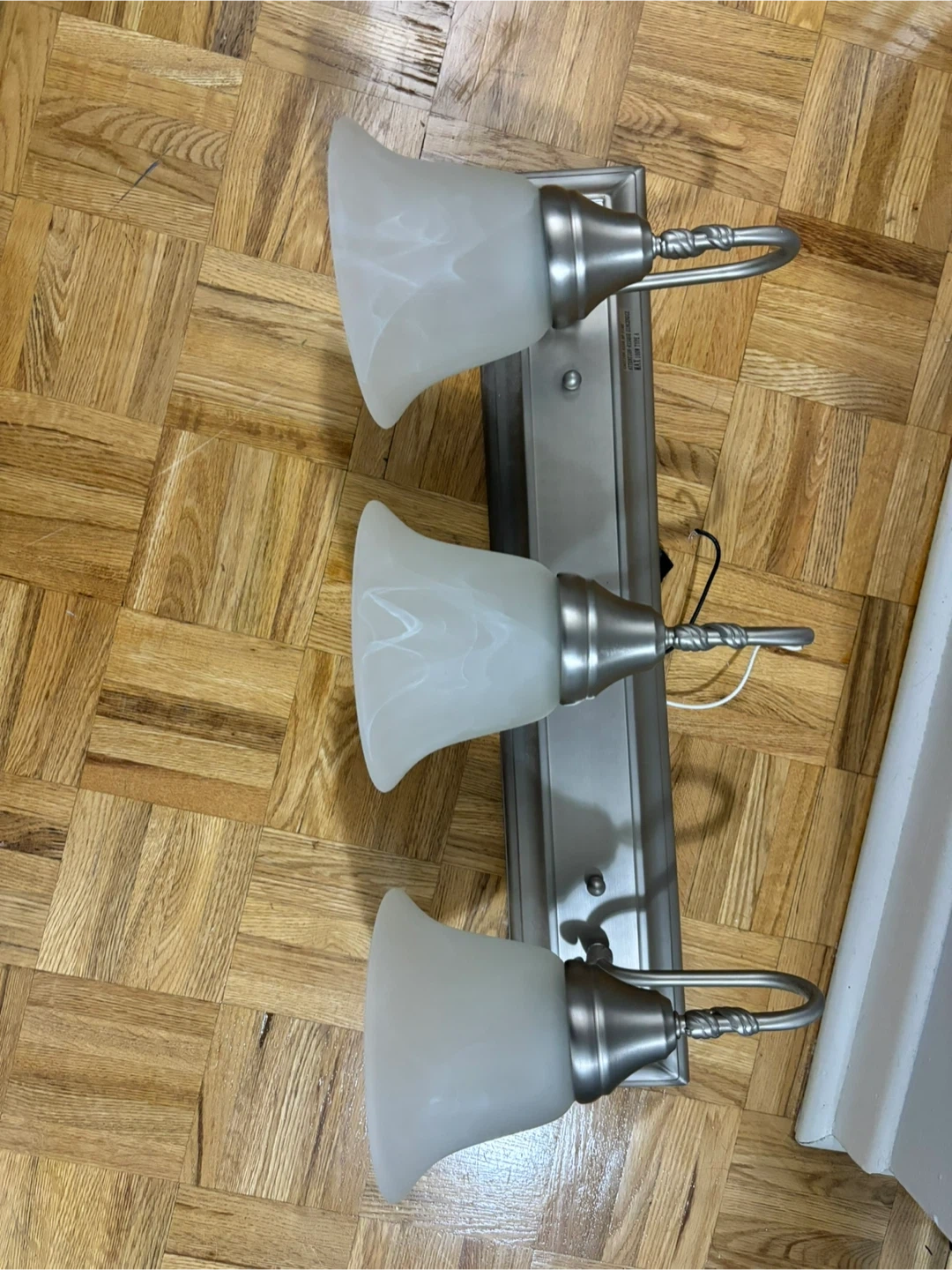 Selling a bathroom vanity light fixture. It has three lights and a brushed nickel finish. It's in great condition and ready to brighten up your bathroom!