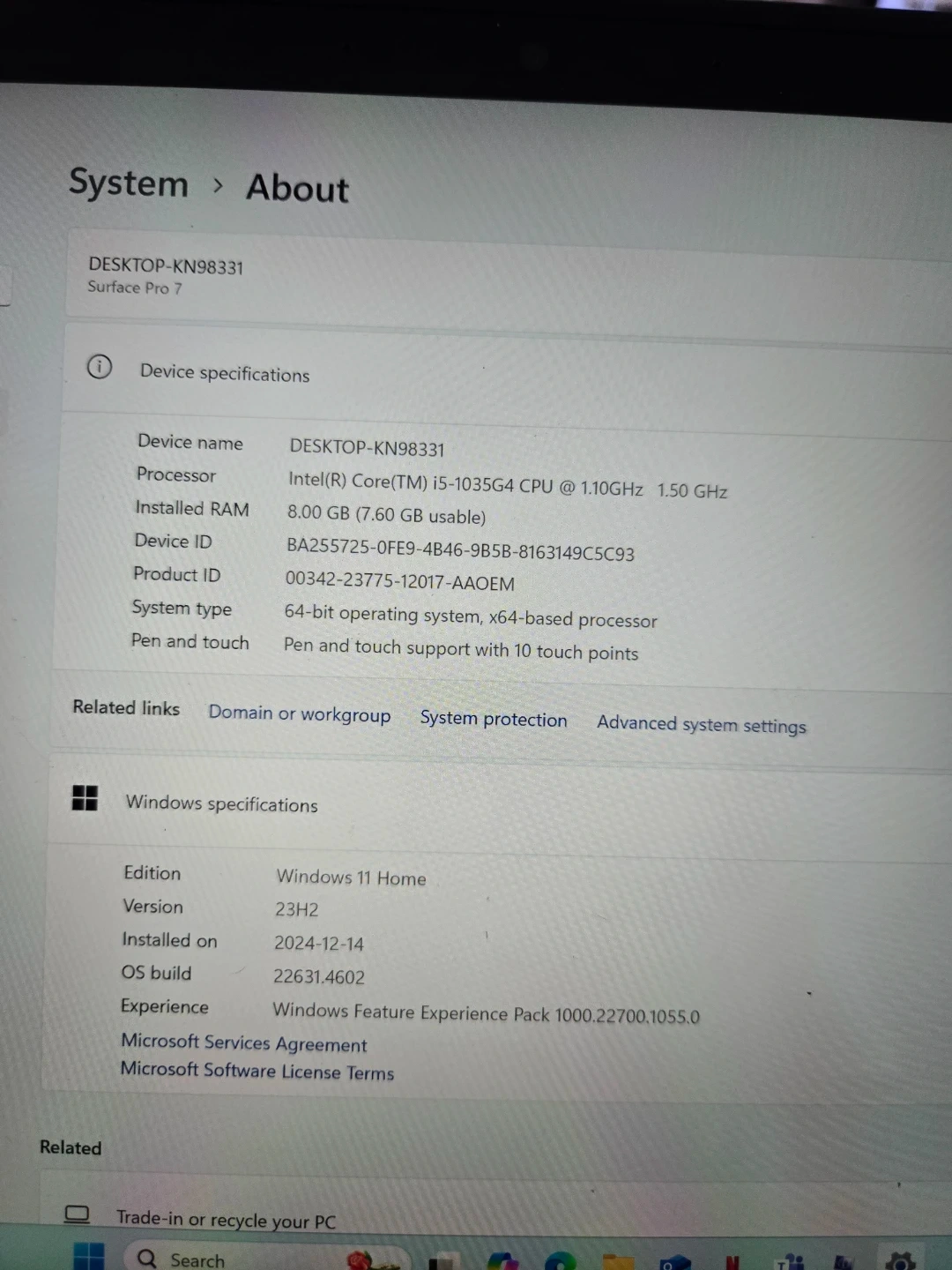 Selling a Microsoft Surface Pro 7. It has an Intel Core i5-1035G4 CPU with 1.10GHz to 1.50GHz processing speed and 8GB of installed RAM (7.60 GB usable). It runs on a 64-bit operating system and has pen and touch support with 10 touch points. It's running Windows 11 Home, version 23H2, installed on 2024 December 14 also come with a protective case.