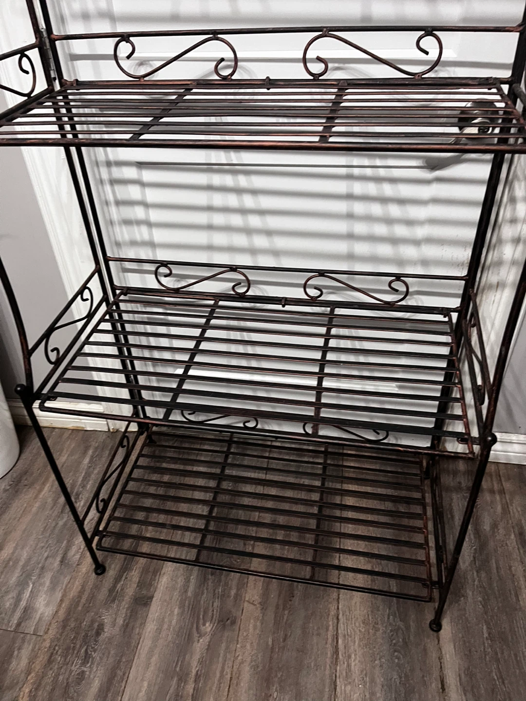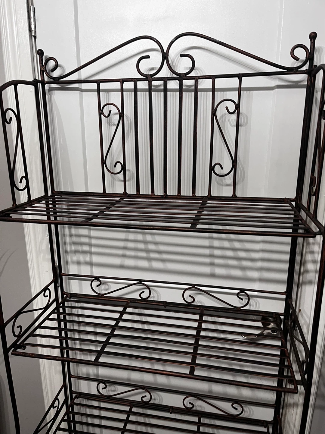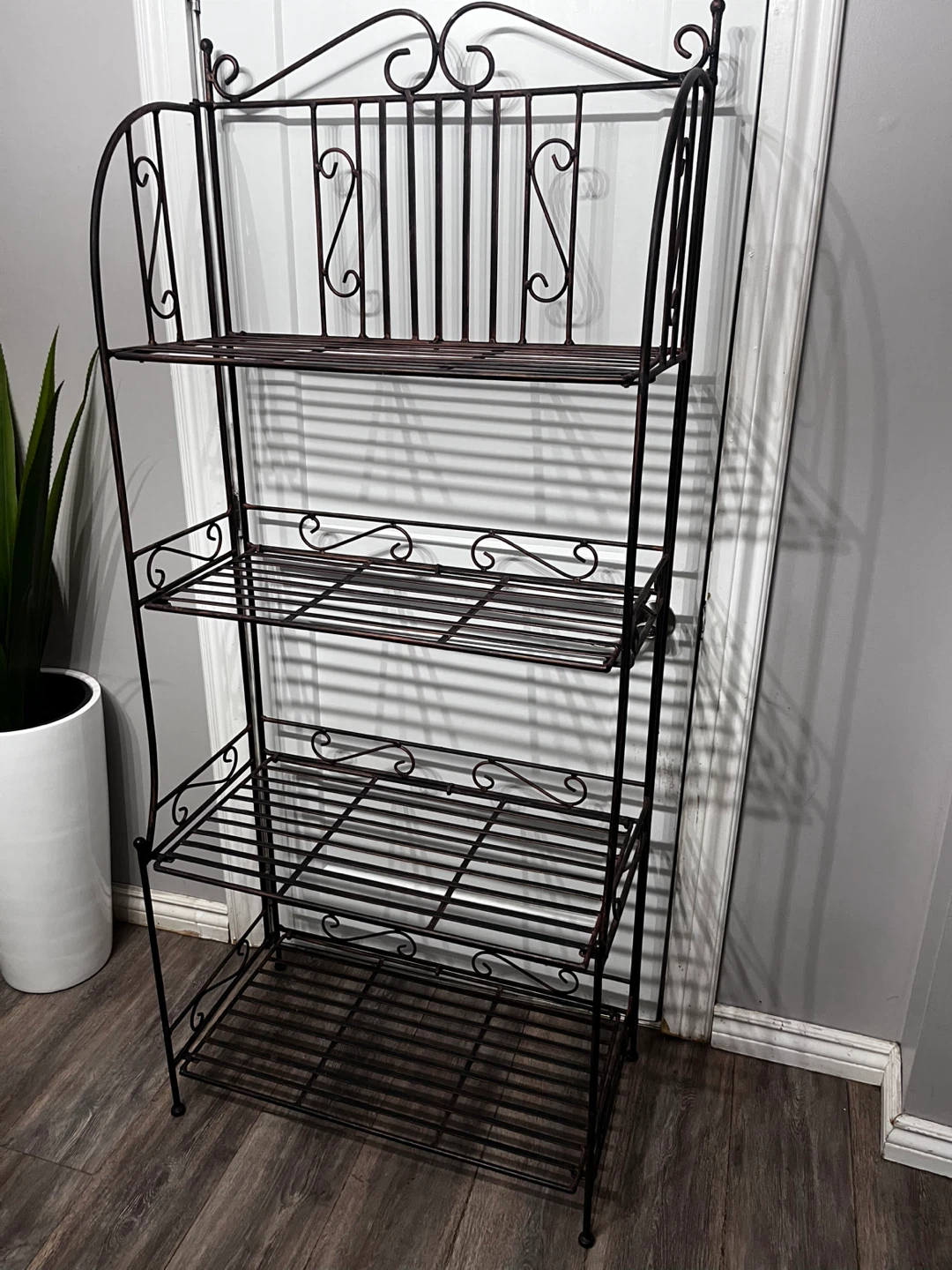 Selling a metal baker's rack in great condition. It features a decorative design with multiple shelves, perfect for adding storage and style to your kitchen or dining area. Also great for plants. It's sturdy and ready for a new home!